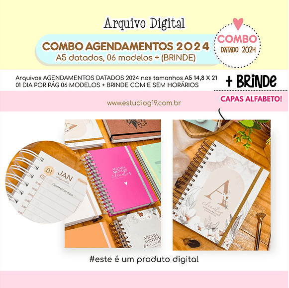 TAMANHO MIOLO A5 (14,8 x 21) n n- AGENDAMENTOS PROCEDIMENTOS CLIENTE 2024: 04 MIOLOS - PÁG: 386  n n- AGENDAMENTOS PROCEDIMENTOS PACIENTE 2024: 04 MIOLOS - PÁG: 386 n nSENDO DE 1 EM 1 HR E SEM HORÁRIO E 30 E 30 MIN E SEM HORÁRIO. n n- AGENDAMENTO MANICURE 2024: 02 MIOLOS - PÁG: 386 n n- AGENDAMENTO NAIL DESIGNER 2024: 02 MIOLOS - PÁG: 386 n n- AGENDAMENTO BARBEIRO 2024: 02 MIOLOS - PÁG: 386 n nSENDO DE 30 EM 30 MIN E SEM HORÁRIO n n- LIVRO CAIXA 2024: 03 MIOLOS  n nSENDO: MIOLO NORMAL 01 DIA POR PÁG: 386 E OUTROS DOIS MIOLOS SENDO SEMESTRAL, 01 DIA POR FOLHA (JAN A JAN) PÁG: 380 E DE (JUL A DEZ) PÁG: 384 n n- MOCKUPS DAS CAPAS n n- FOTOS PARA AJUDAR NA DIVULGAÇÃO n n- CAPAS EM PNG E PDF n n- DIVISÓRIAS PARA OS MESES - OPCIONAL n n- BRINDE: CAPAS ALFABETO FLORAL EM PNG E PDF NÃO EDITAVEIS!