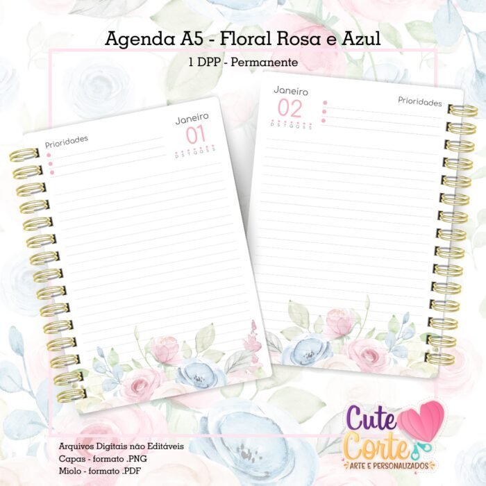 Agenda Datada 2025 – Floral Rosa e Azul – 1DPP (Cute Corte)