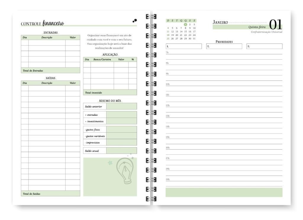 • Controle Financeiro Mensal (No layout semanal o Controle Financeiro é no final do mês corrente)