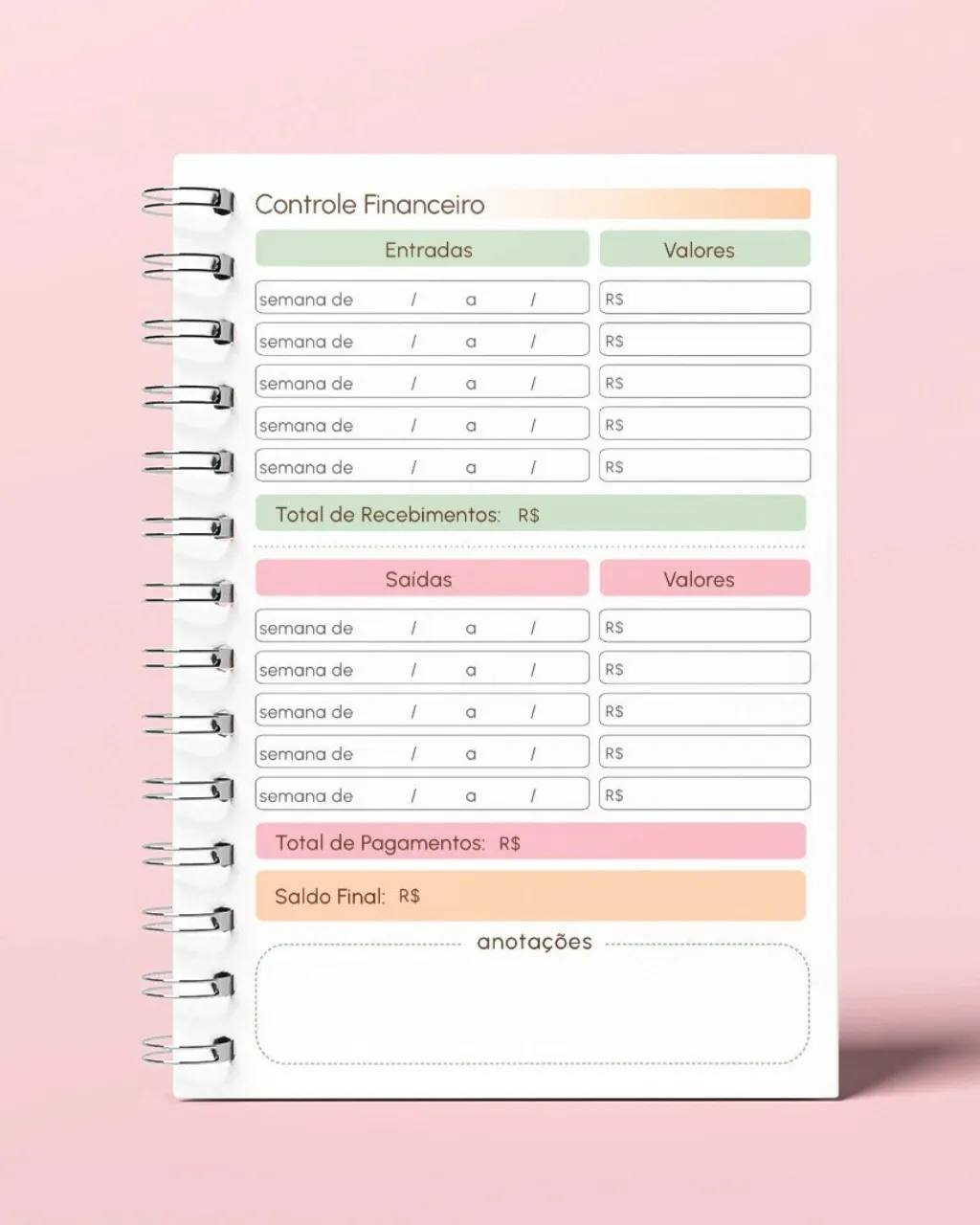 - Estrutura organizada para anotações de compromissos, metas e tarefas.