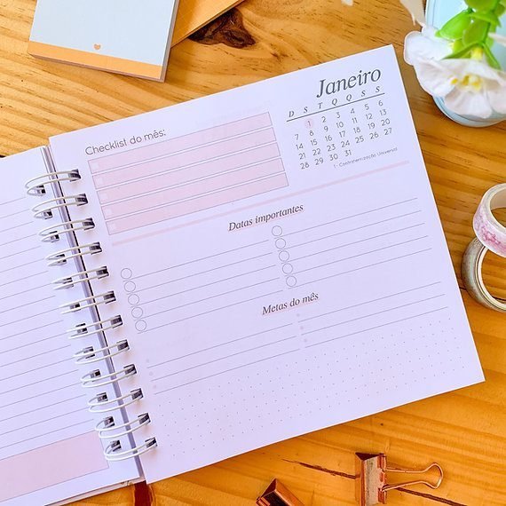 - Páginas mensais: Checklist do mês, datas importantes, metas do mês, calendário do mês e financeiro mensal;