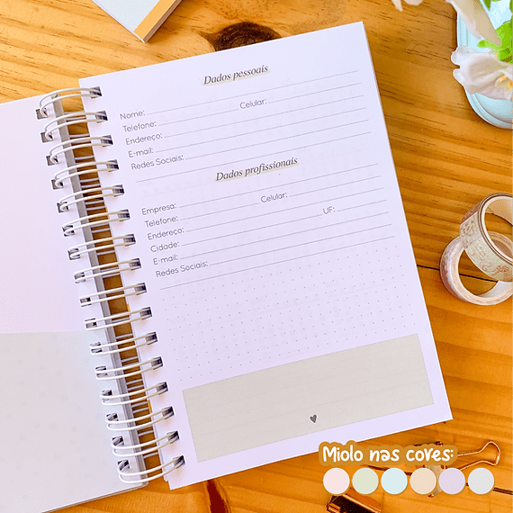 - Miolo em 6 cores: areia, azul, cinza, rosa, lilás e verde;