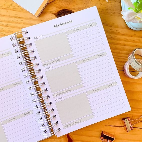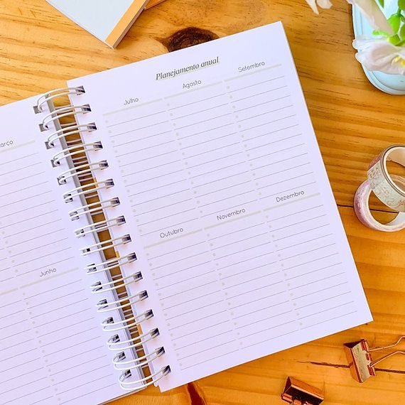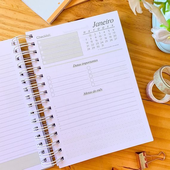 - Páginas mensais: Checklist do mês, datas importantes, metas do mês, calendário do mês e financeiro mensal;