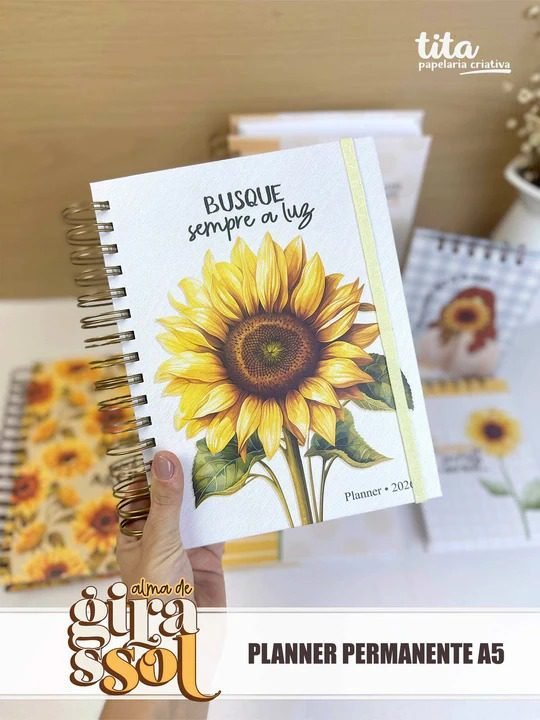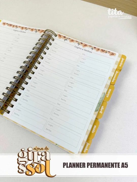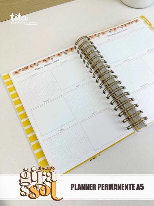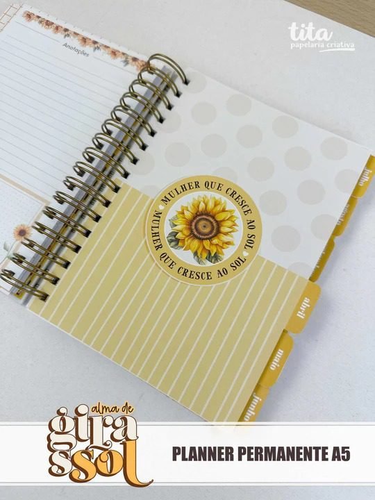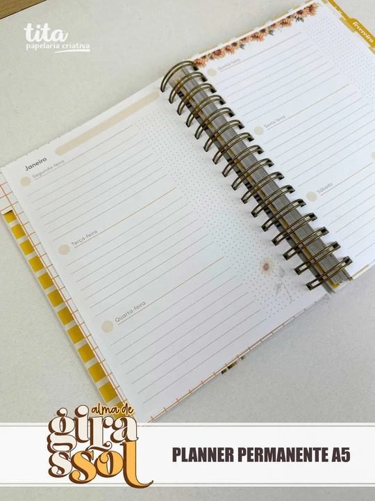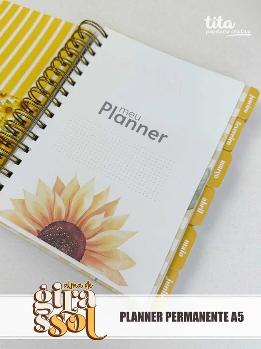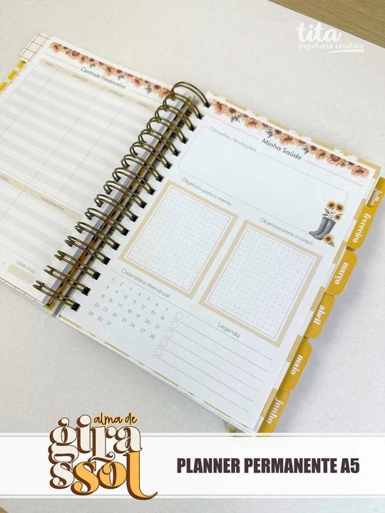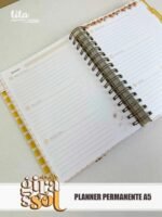 - Planner A5 Permanente – miolo personalizado, divisórias, marcadores, adesivos, bolsinho e várias opções de capa.