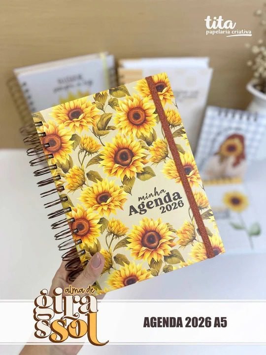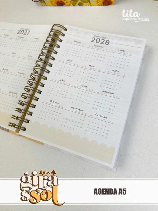 - Agenda A5 Datada 2026 – miolo 1 e 2 dias por folha, marcadores, adesivos, bolsinho e várias opções de capa.