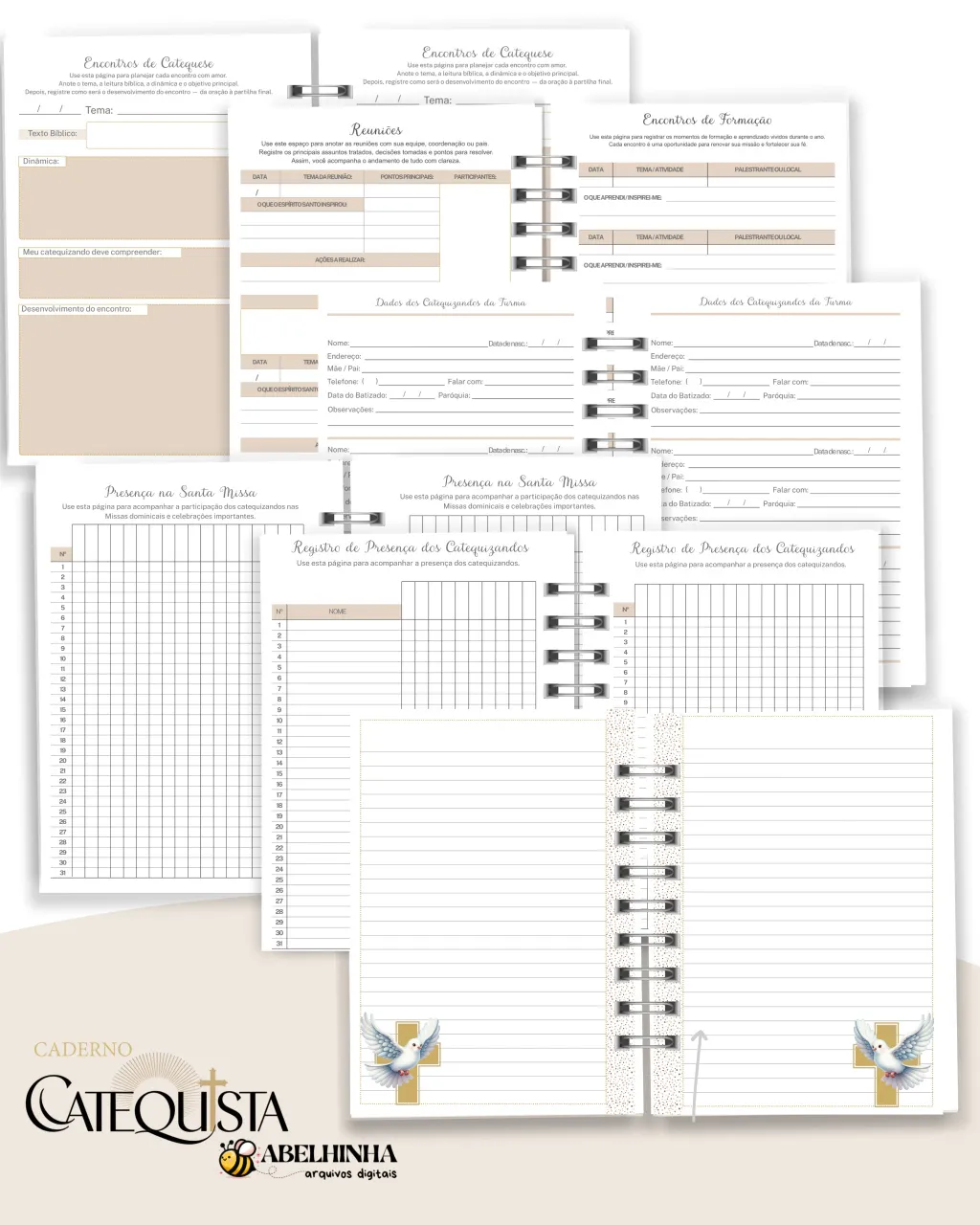 - 🗂️ Páginas de organização — cronograma da catequese, reuniões, formações, planejamentos e anotações inspiradoras.