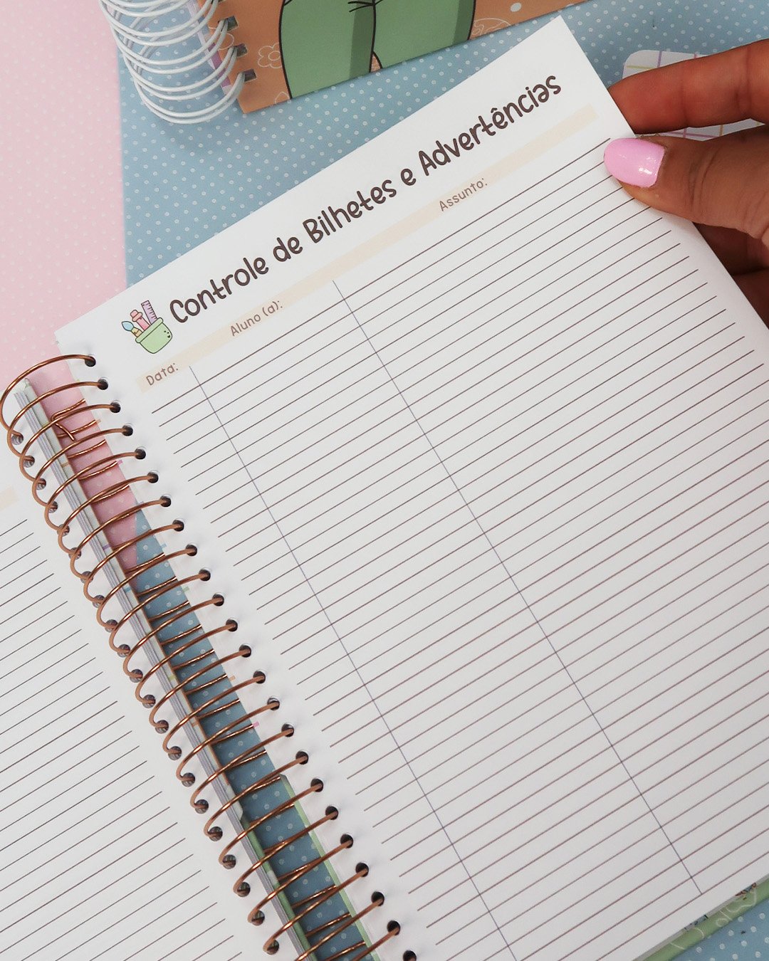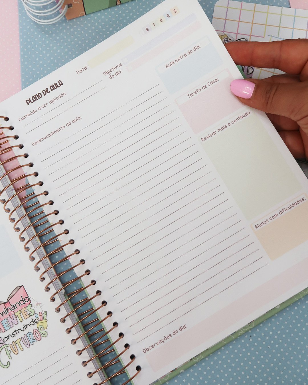 O caderno contém 250 páginas organizadas de forma prática para o dia a dia do professor, incluindo: