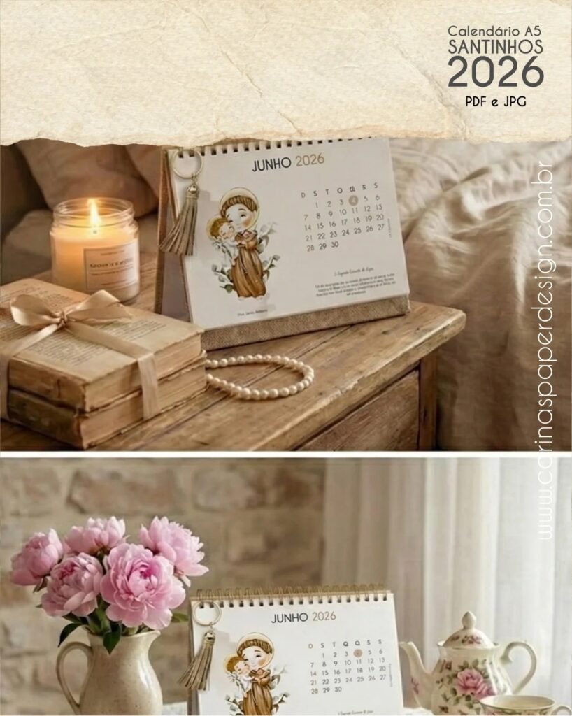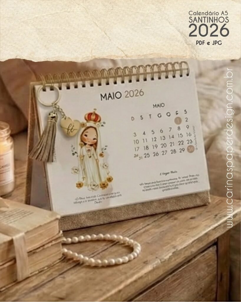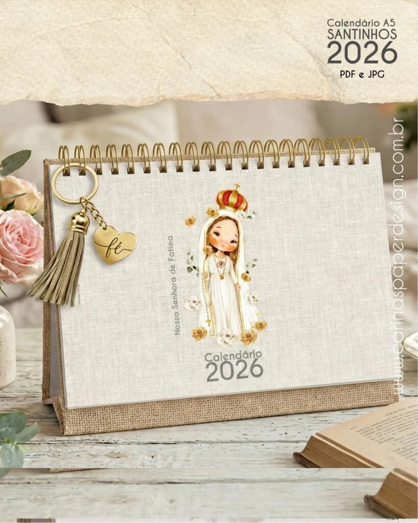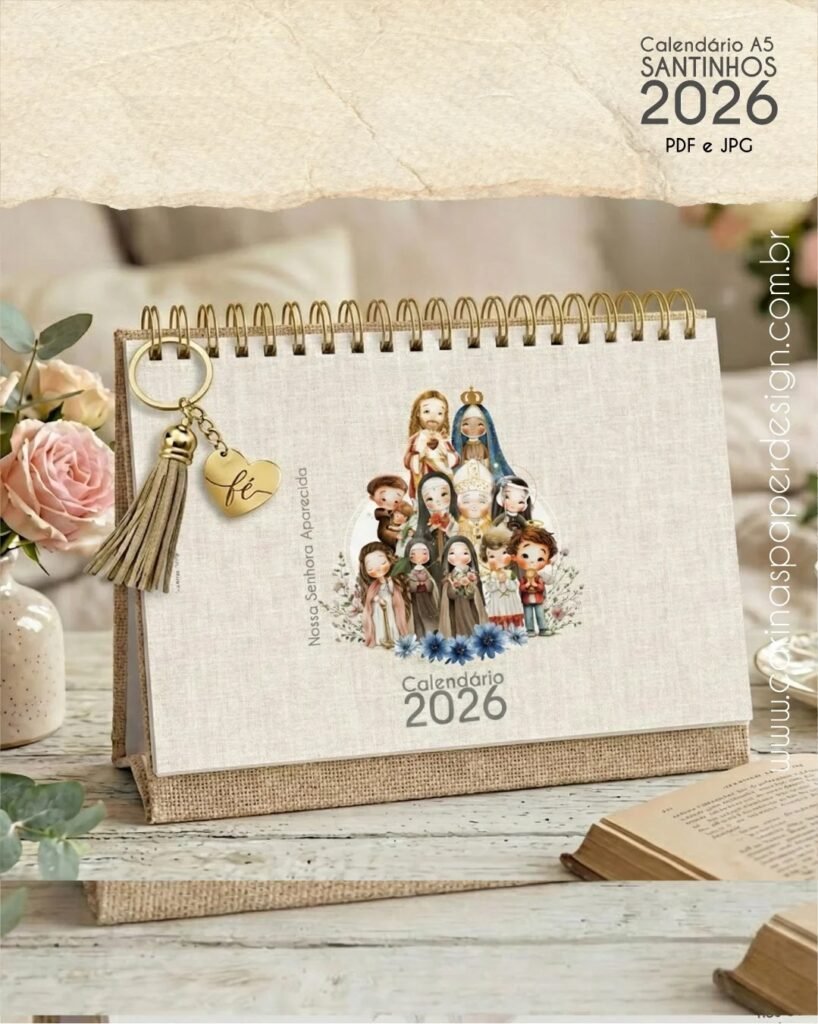 Calendário de mesa Santinhos A5 horizontal 2026 + 12 Capas PDF (Carinas Paper)