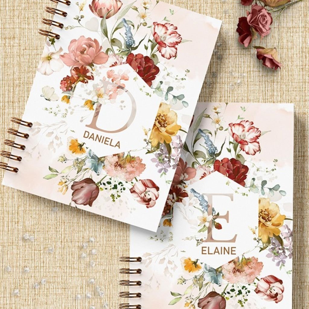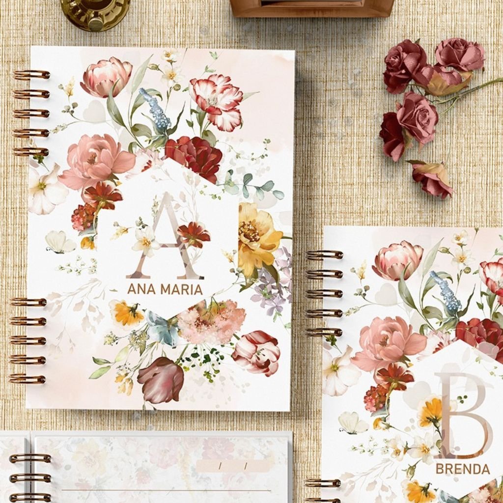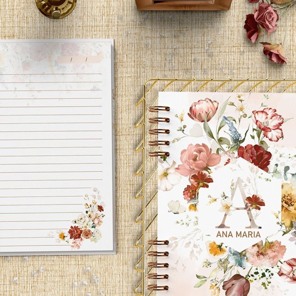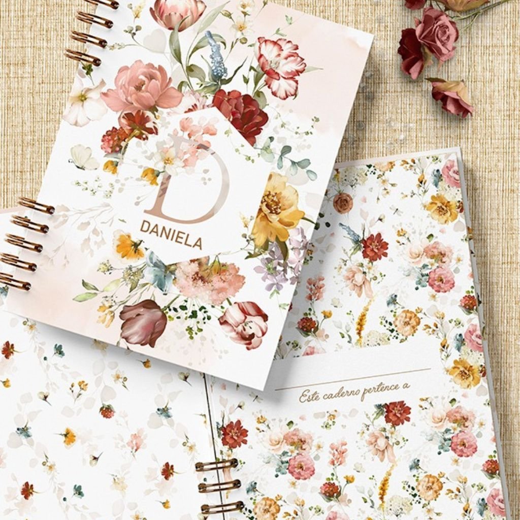 Capas caderno com alfabeto de A a Z e miolo de folhas pautadas decoradas em floral