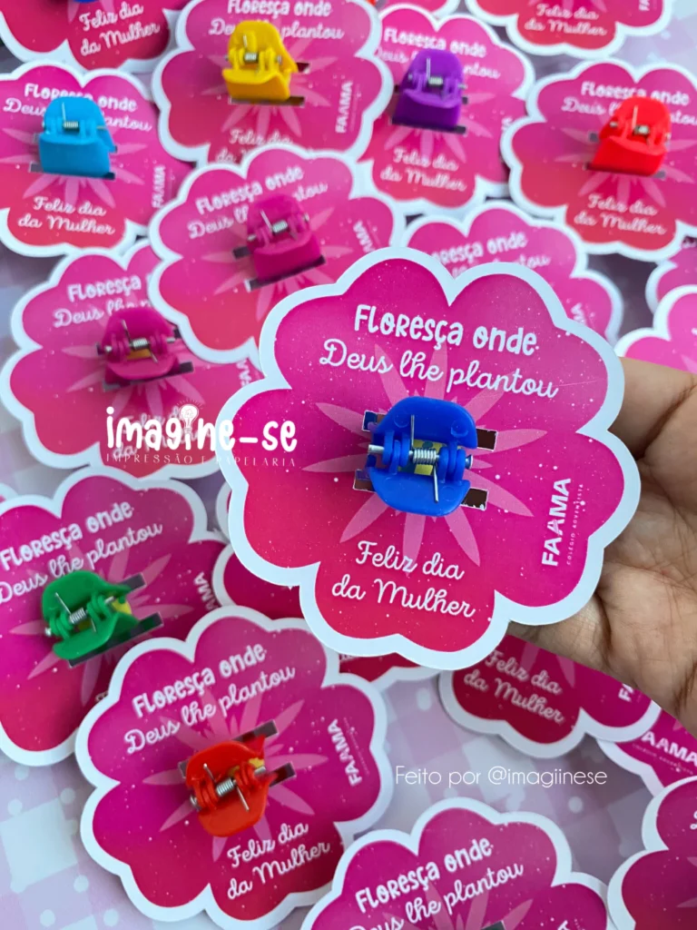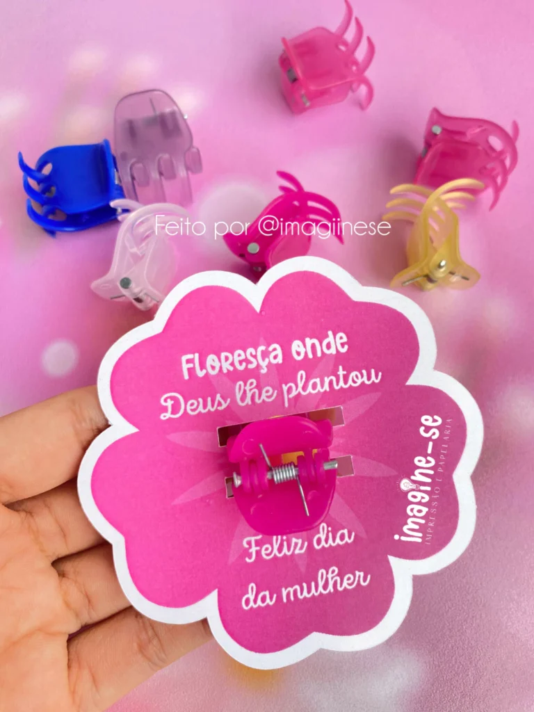 Este é um arquivo digital com um cartão formato flor para colocar uma presilha com tema dia das mulheres.