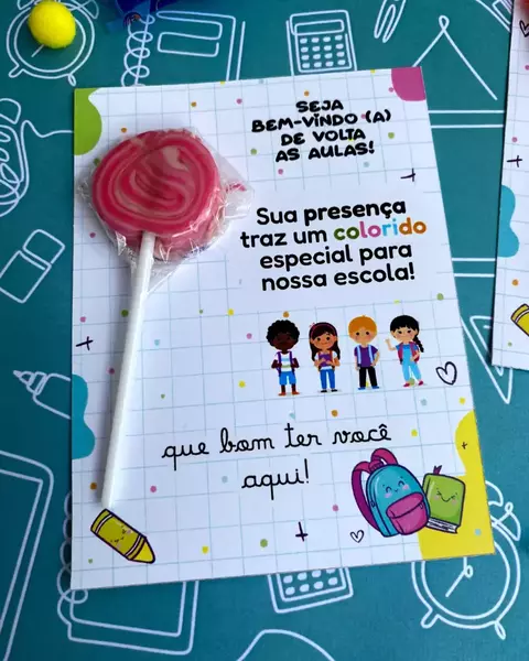-Inclui 01 modelo de CARDS PARA COLOCAR PIRULITO com tema volta às aulas.