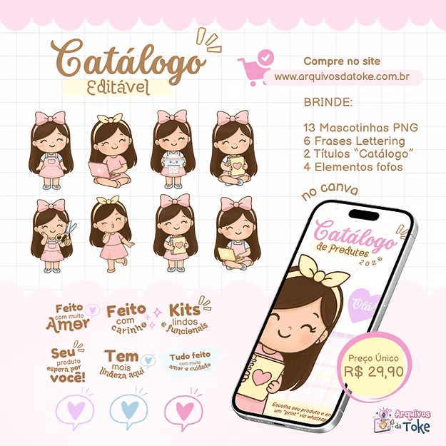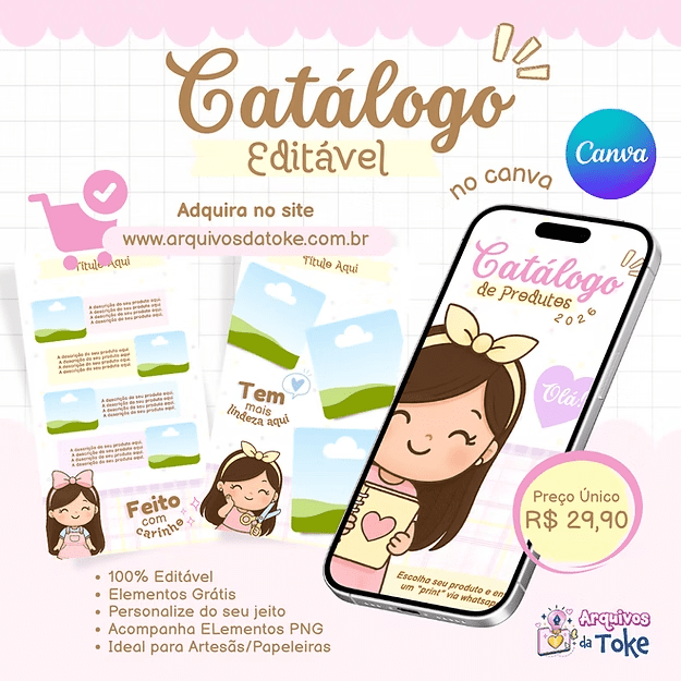 Com layout moderno, mascotes exclusivas e elementos fofos, você personaliza tudo diretamente no Canva, de forma prática e rápida. Ideal para quem quer impressionar clientes, organizar coleções e apresentar lançamentos de maneira impecável.