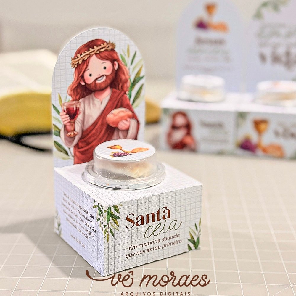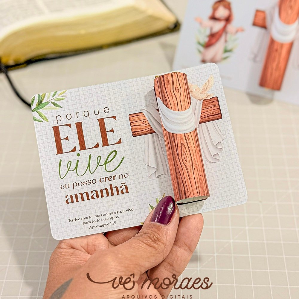 Entre os itens incluídos estão 4 artes para Santa Ceia, 4 artes para bíblia, 3 artes para card batom, arte para mini bíblia, 6 artes para marca-página com verso, 3 artes para porta Bis cruz, 4 artes para card, 3 artes para rótulo, 3 artes para porta docinho e 4 artes para tubolata 8×6,5. O produto também acompanha tabela de medidas para impressão, link de fornecedores e fotos sem logo para divulgação, facilitando tanto a produção quanto a apresentação dos produtos nas redes sociais e no WhatsApp.