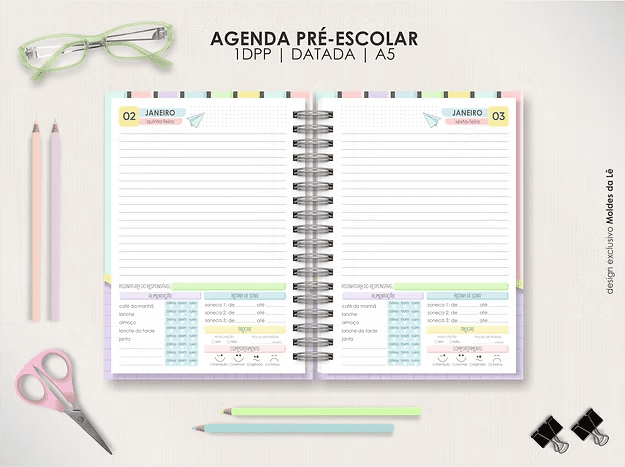 - Cada página possui espaço para preencher dia, mês e dia da semana;