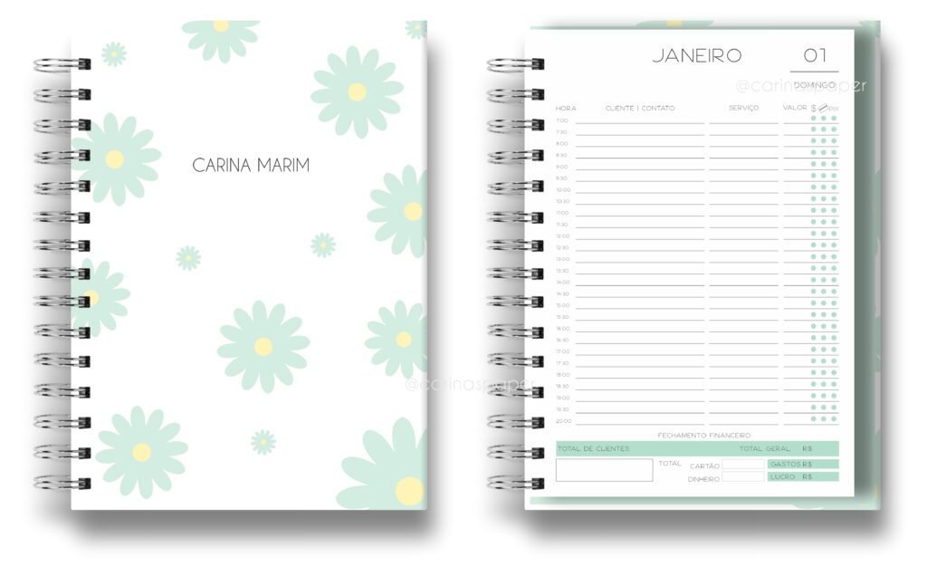 - Fluxo de caixa mês a mês (Janeiro a dezembro) no final da agenda para controlar a entrada de pagamentos diário mês a mês.