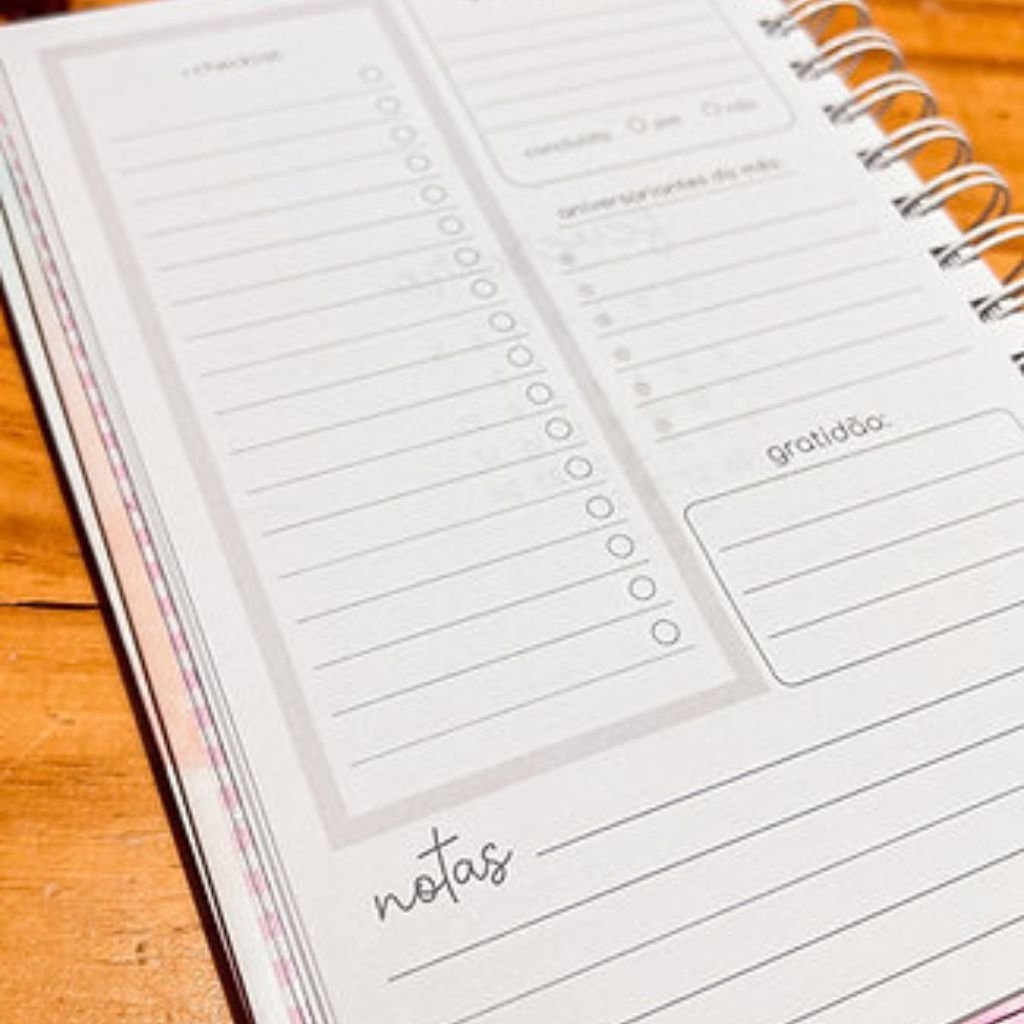 - Divisórias, com o mês e calendário, informações para checklist, gratidão, meta e aniversariates do mês.