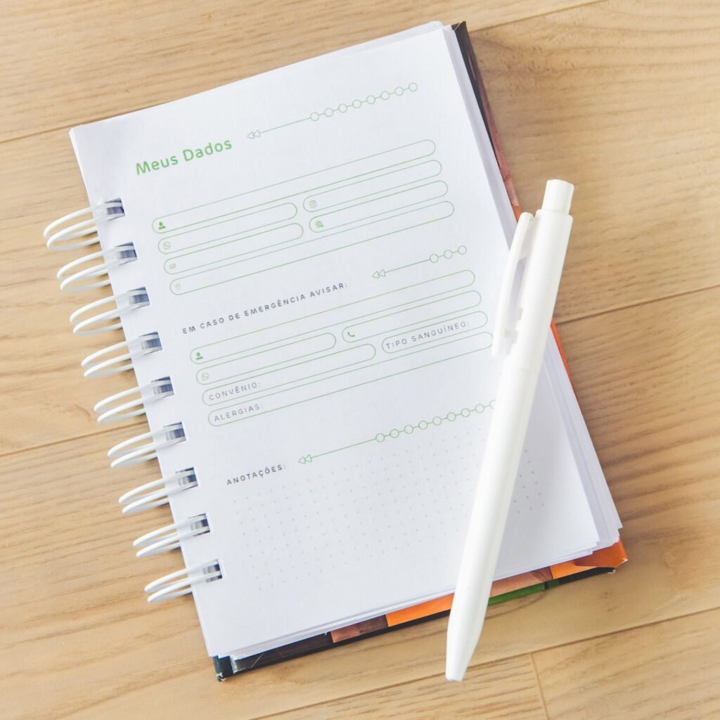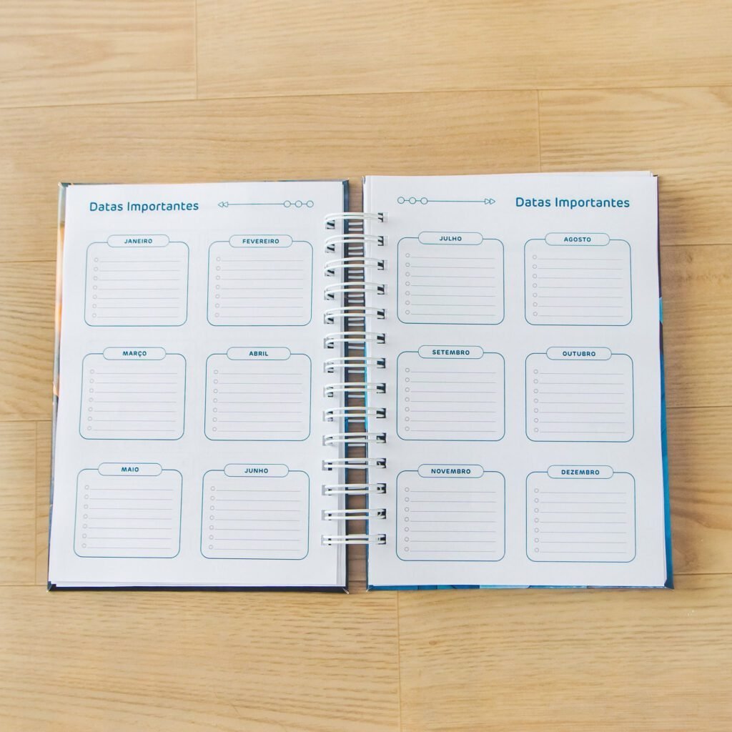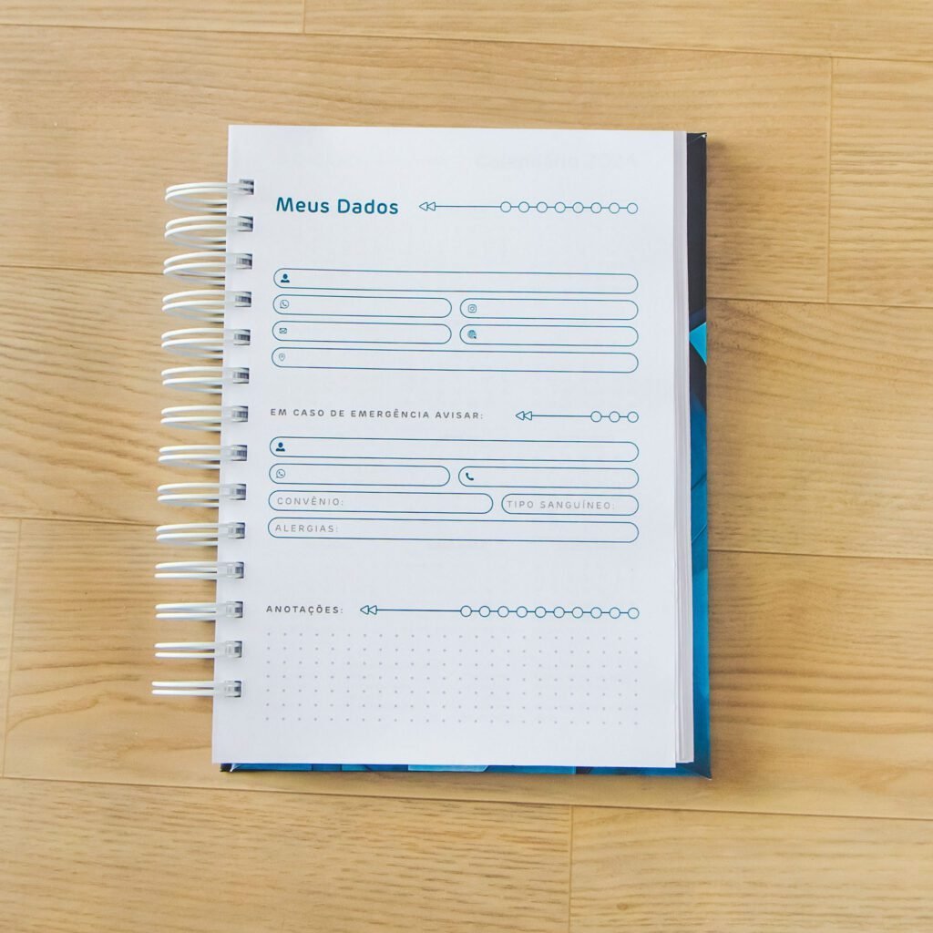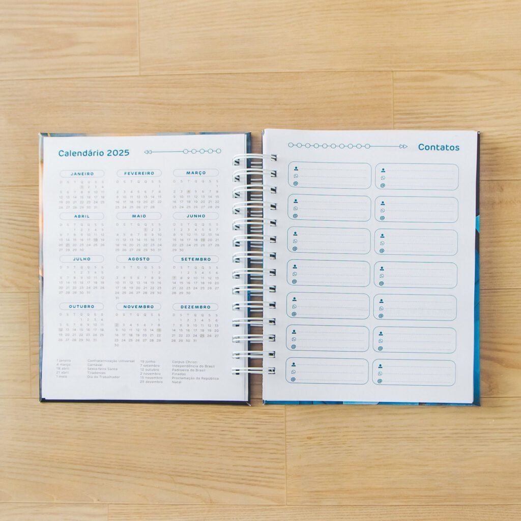 • Páginas iniciais: Dados pessoais, Calendários 2024 e 2025, Contatos, Logins e senhas, Pix importantes, Datas importantes, Controle Financeiro anual