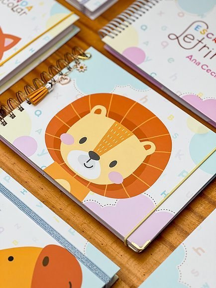 Escrevendo Letrinhas é um caderno de caligrafia com imagens e as letras do alfabeto para a criança treinar a sua escita, muito fofo e divertido esse produto concerteza será sucesso ai no seu portfólio de encadernação.