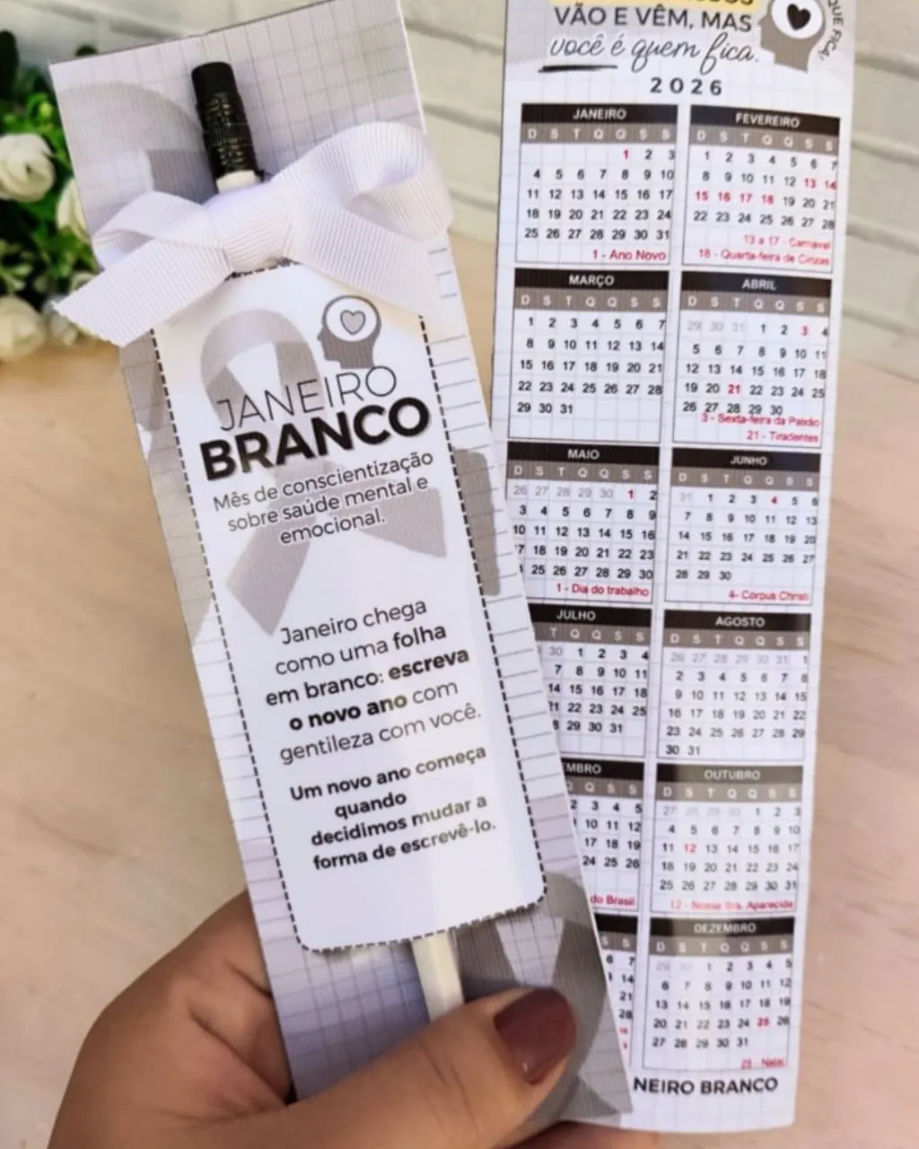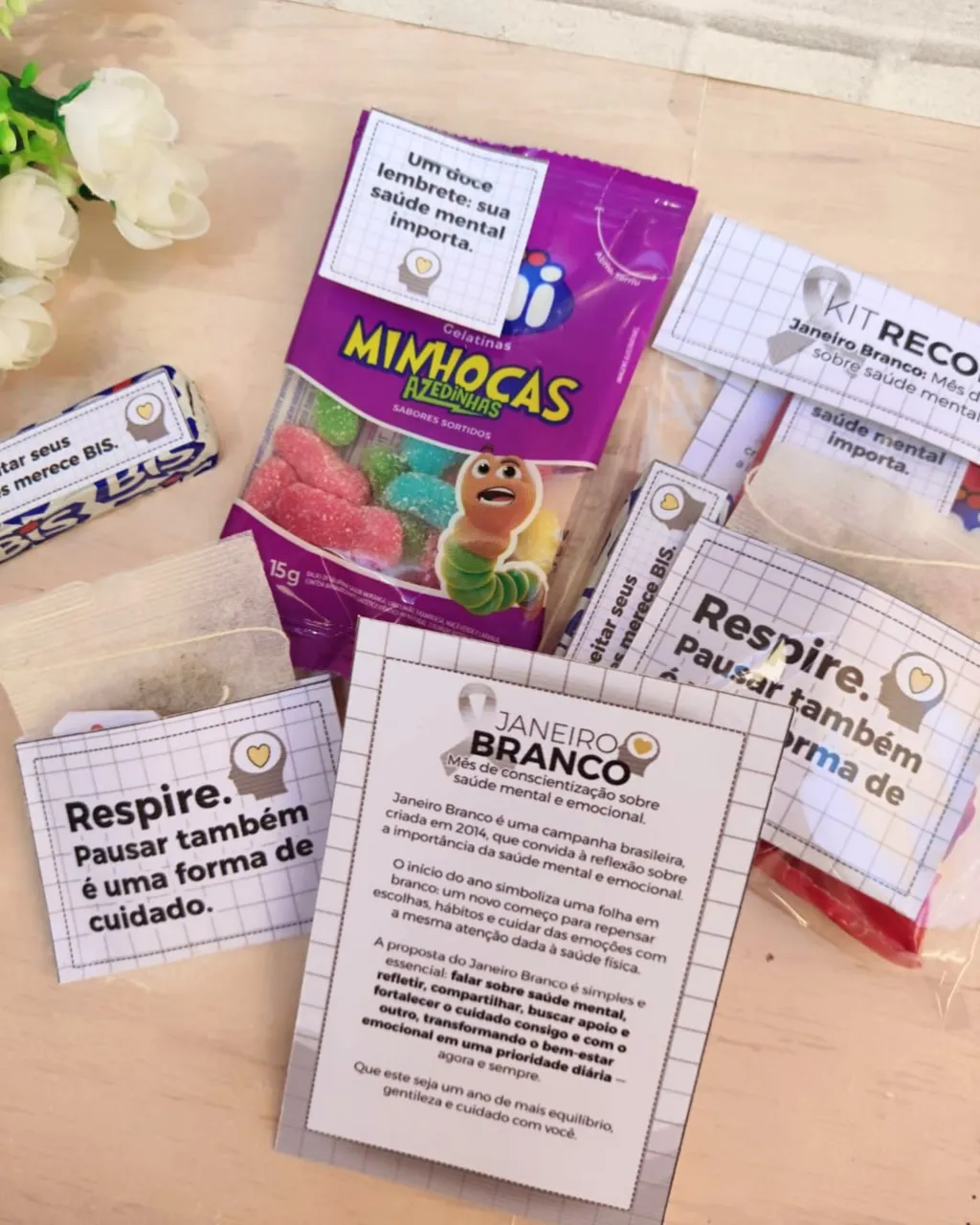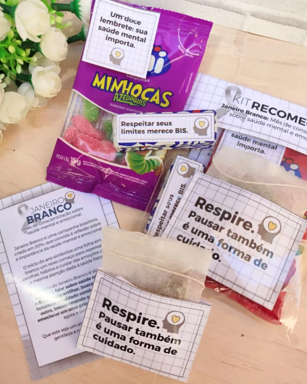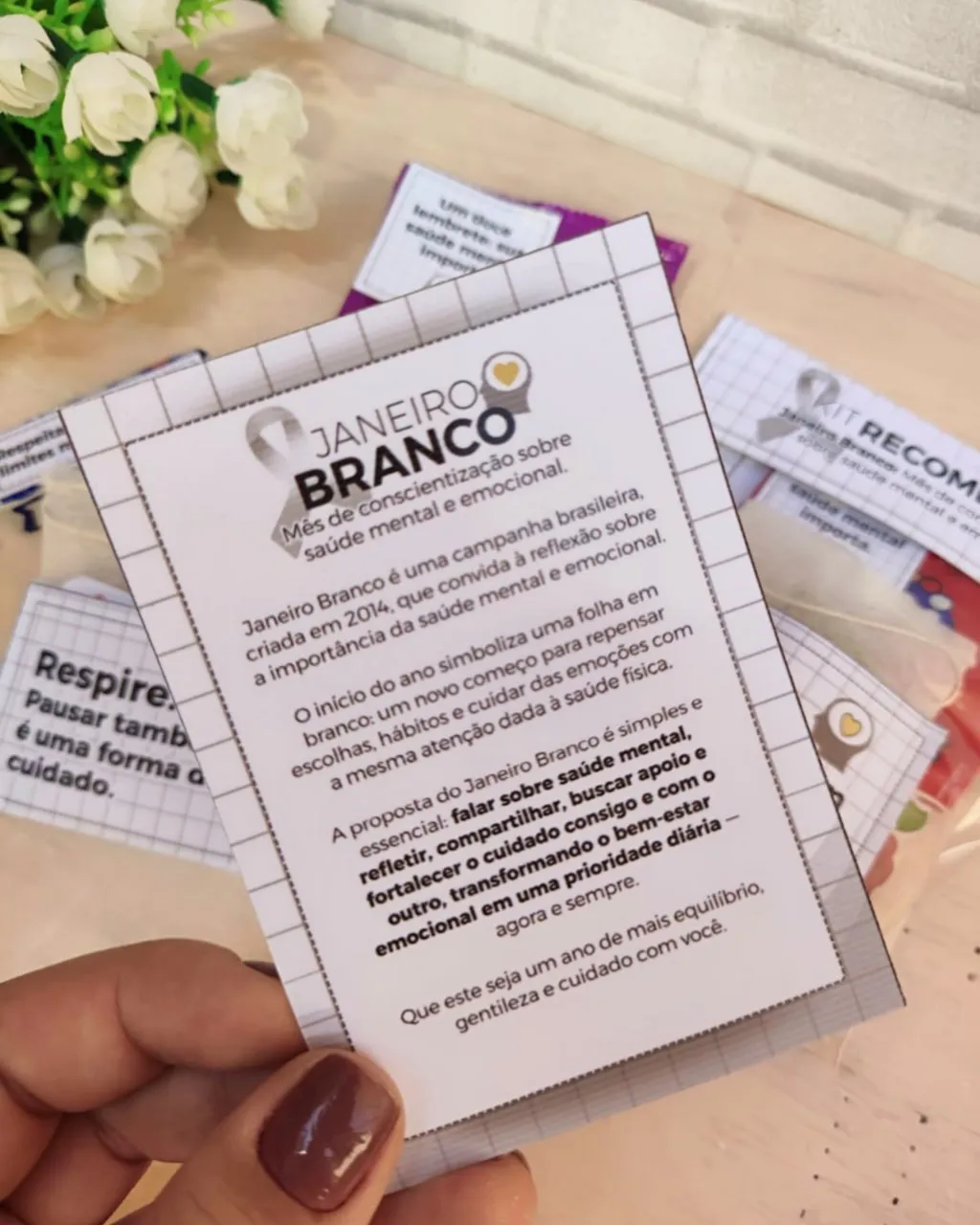 • Kit completo para ações de Janeiro Branco, campanha voltada ao bem-estar e saúde mental.