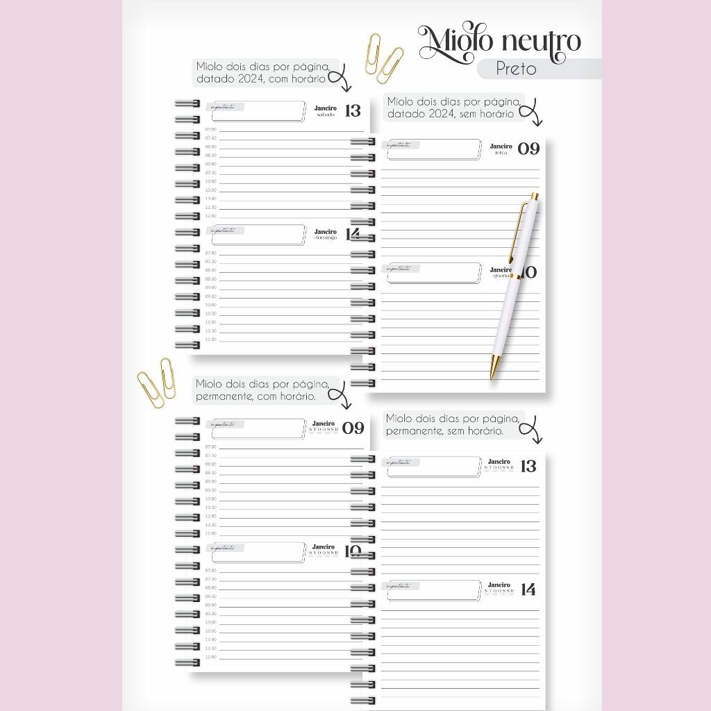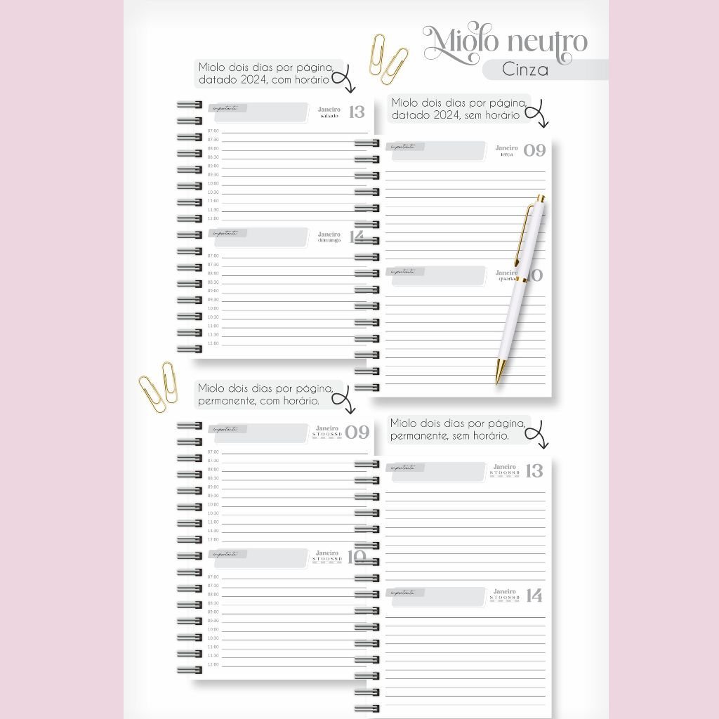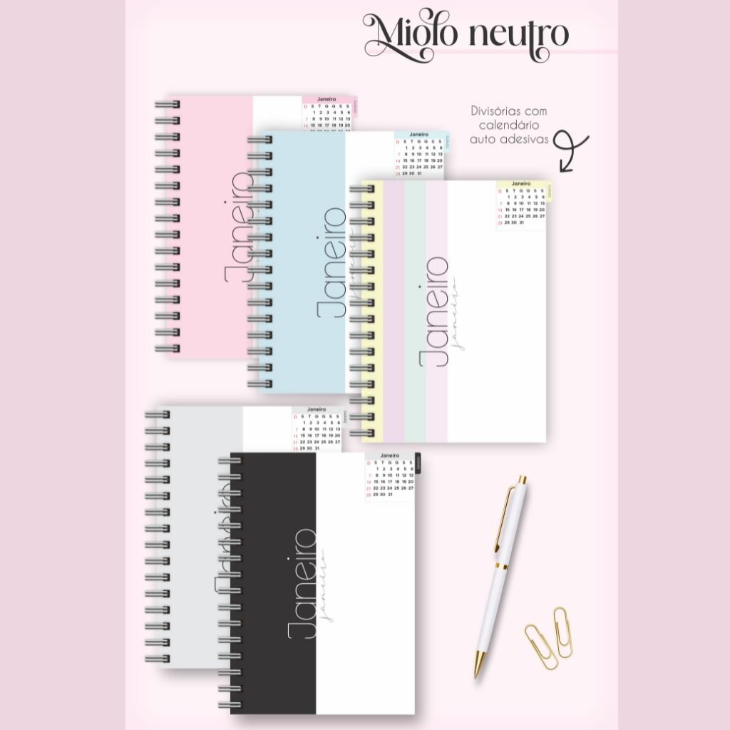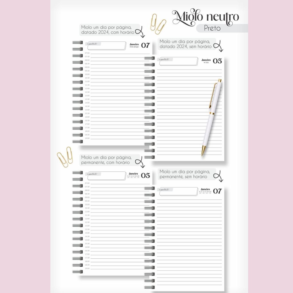 Combo Miolos Neutro – Agendas 2024 c/hora e s/hora – 5 Cores (Lina)