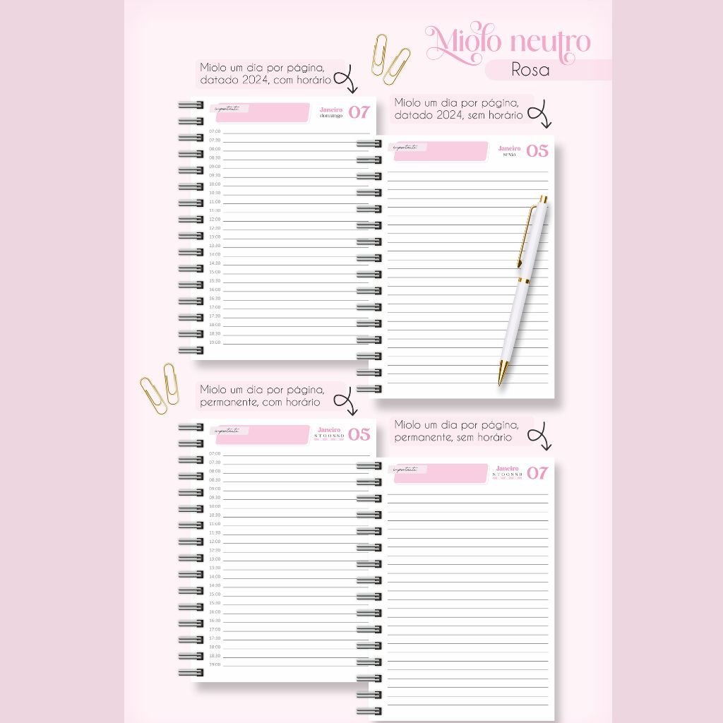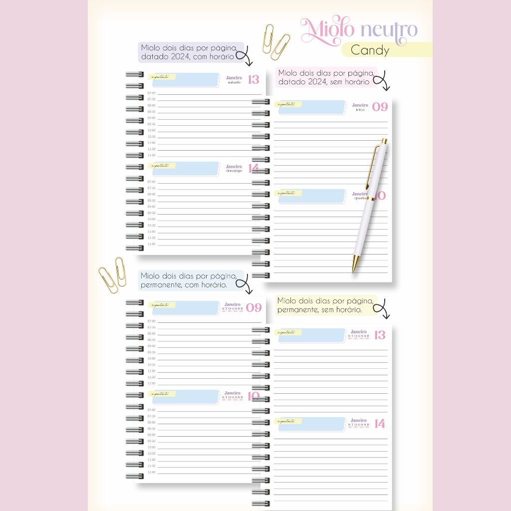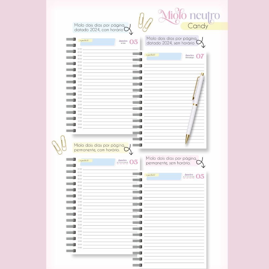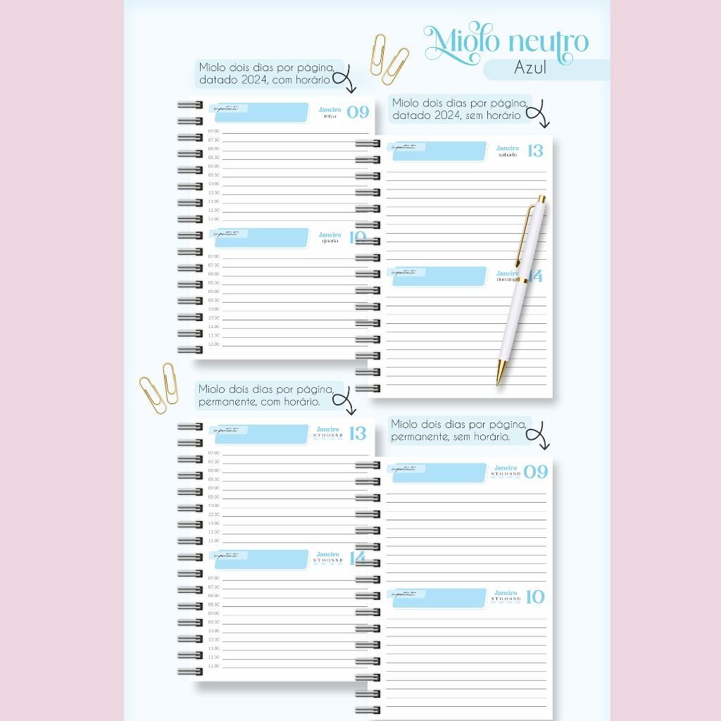 Combo Miolos Neutro – Agendas 2024 c/hora e s/hora – 5 Cores (Lina)