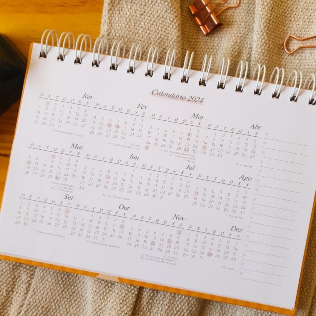 - Páginas iniciais: calendários (2023, 2024, 2025 e 2026), planejamento anual e anotações;