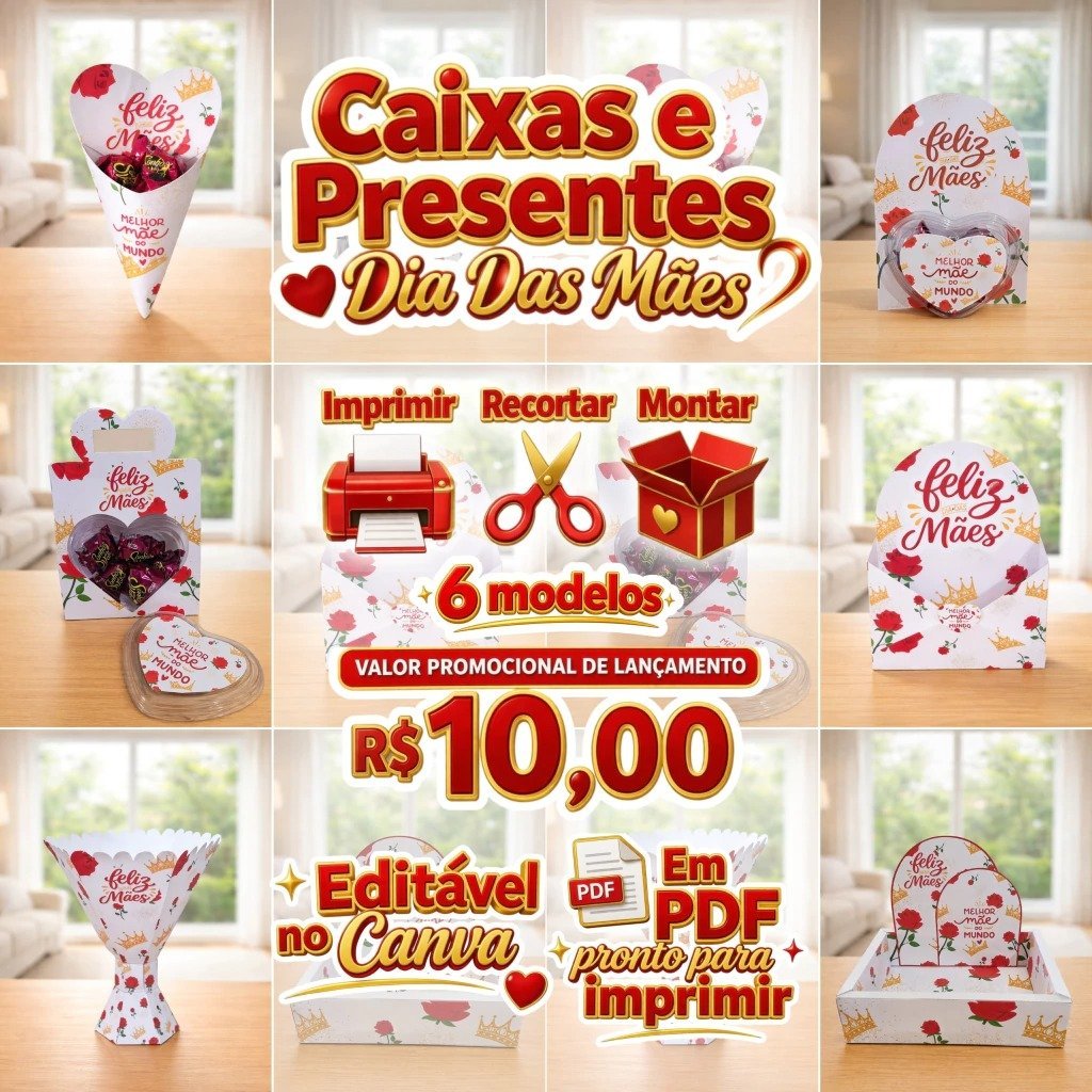 🌹Dia das Mães 2026 ✅ Caixa Cesta ✅ Caixa Envelope ✅ Buquê ✅ Cone Coração ✅ Maletinha ✅ Cartão Gigante Arquivo em PDF