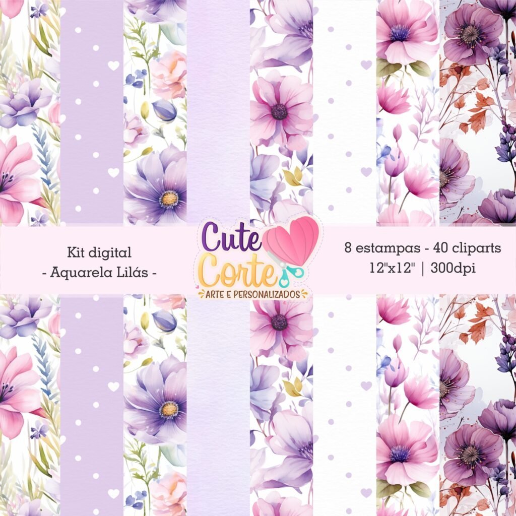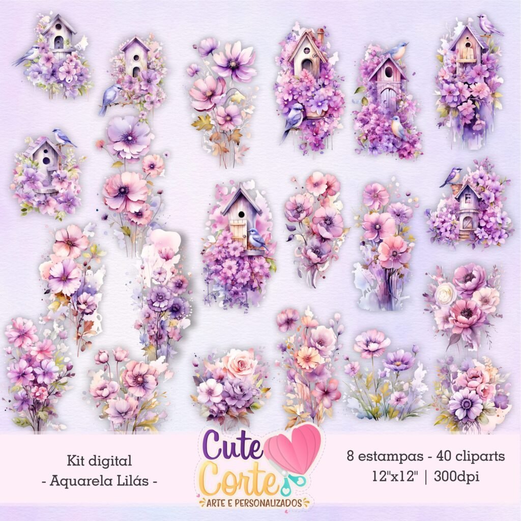 Kit Digital – Aquarela Lilás (8 Papéis Digitais + 40 Cliparts)