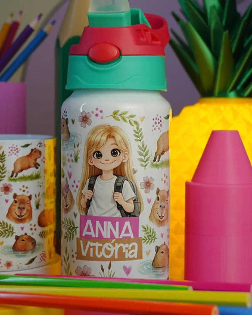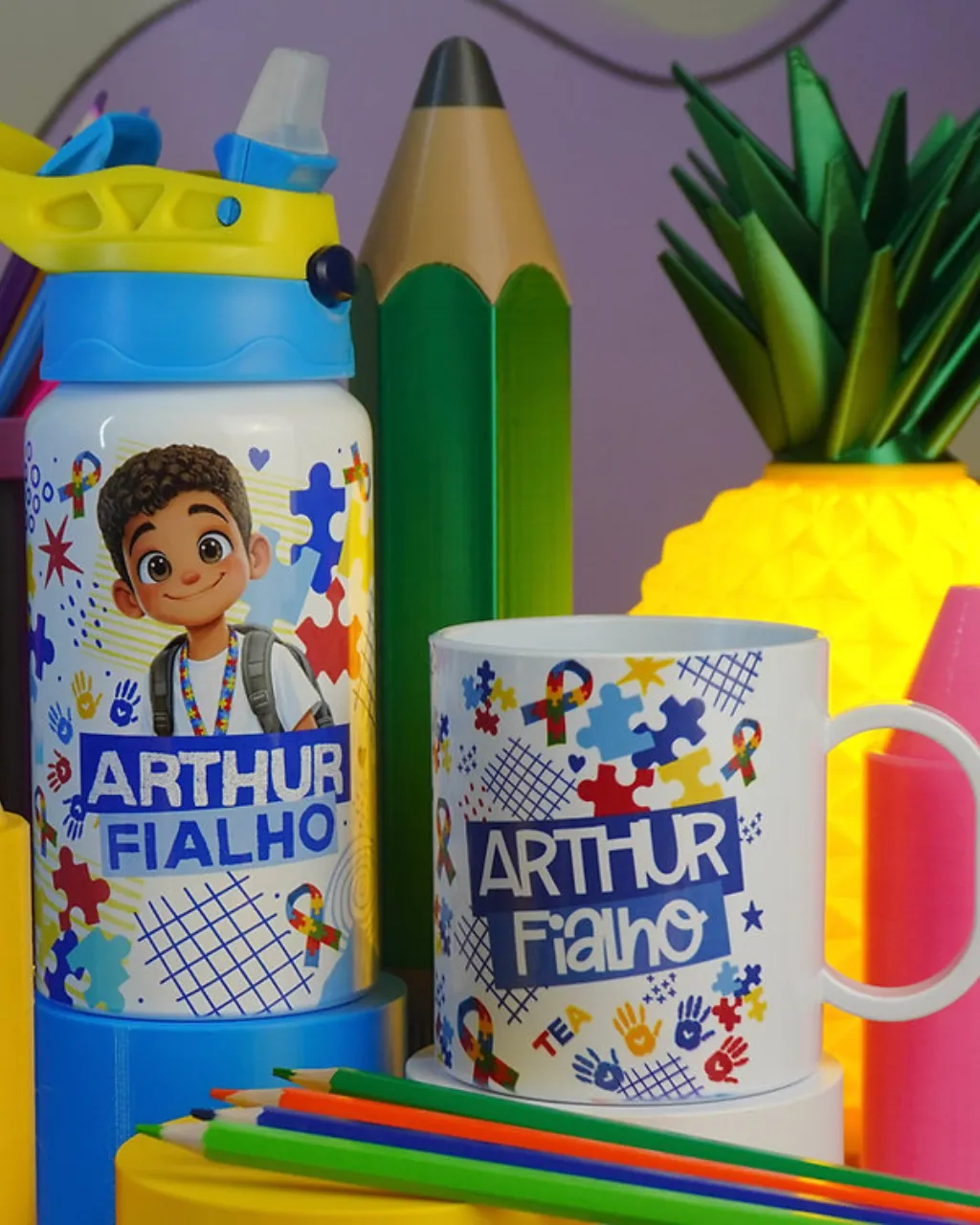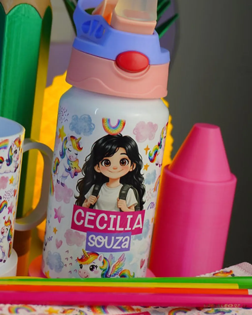 - Personalização de canecas, garrafas e toalhinhas escolares
