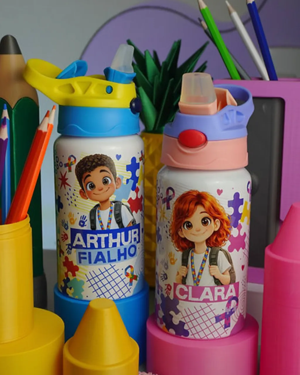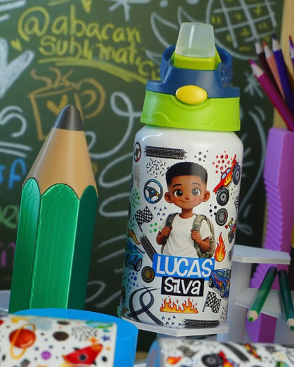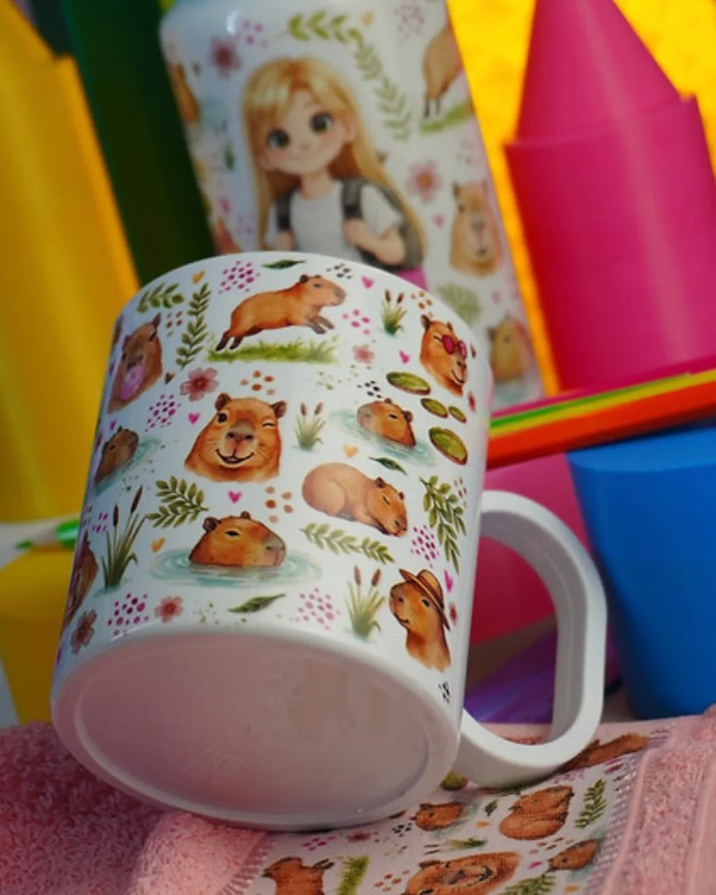 - Personalização de canecas, garrafas e toalhinhas escolares