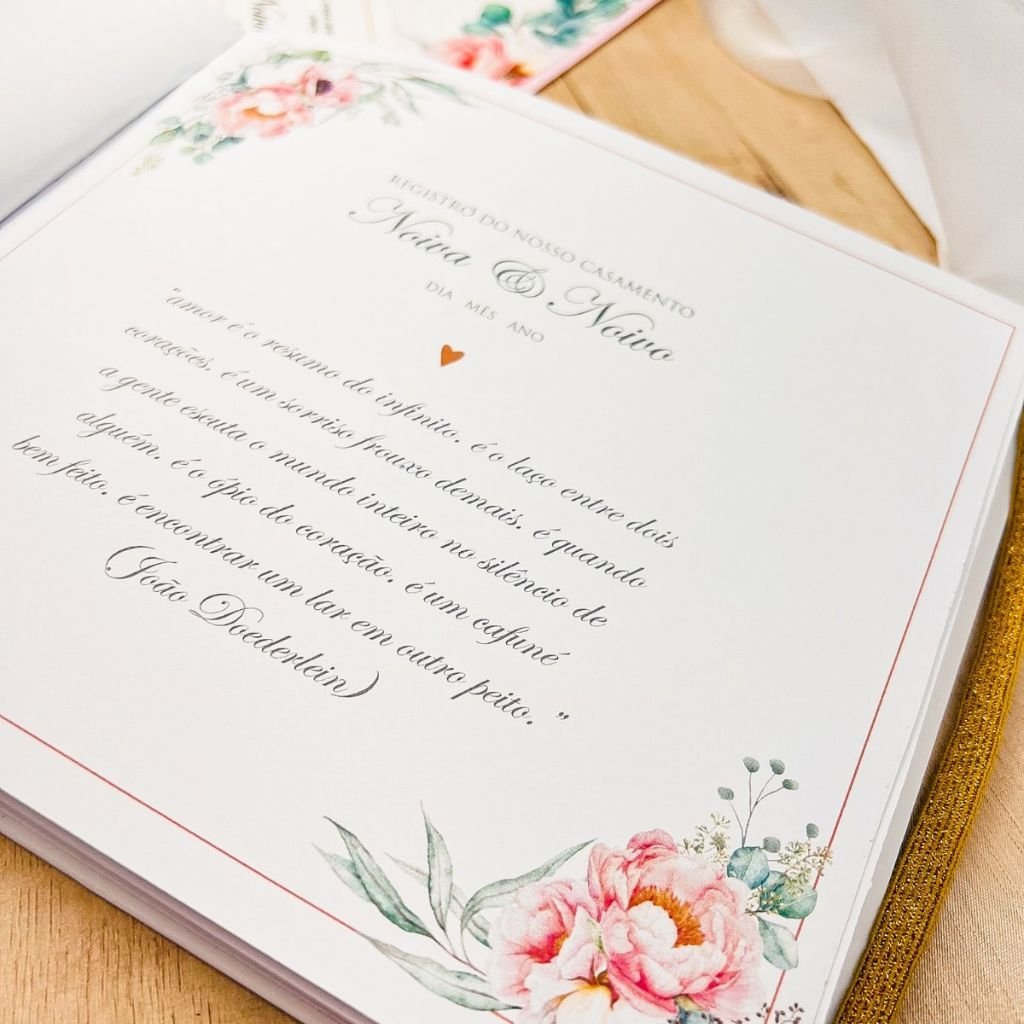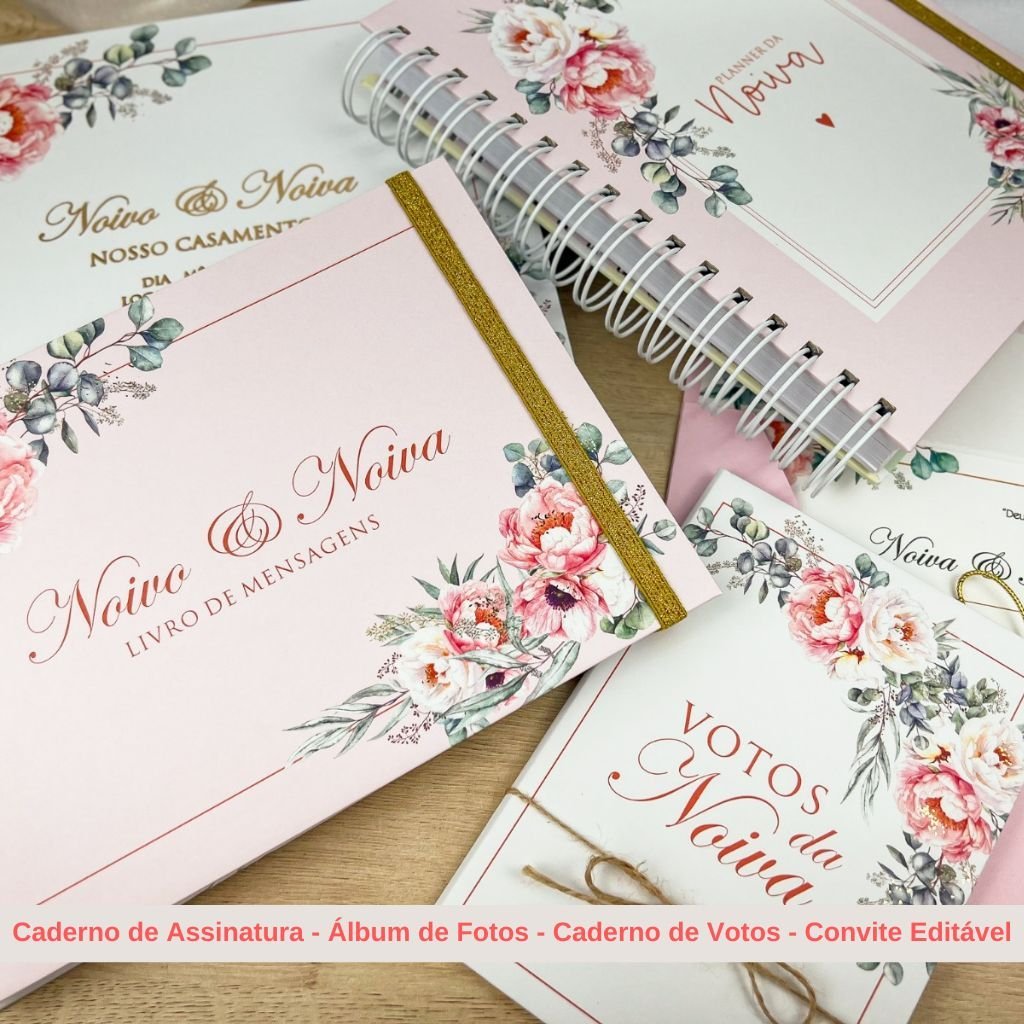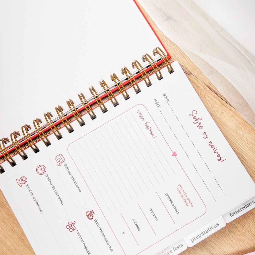 Divisórias: NOIVOS, PREPARATIVOS, CERIMÔNIA E FESTA, LEMBRANCINHAS, CONVIDADOS, FORNECEDORES, CHÁS, LUA DE MEL, CHECKLIST E ANOTAÇÕES.