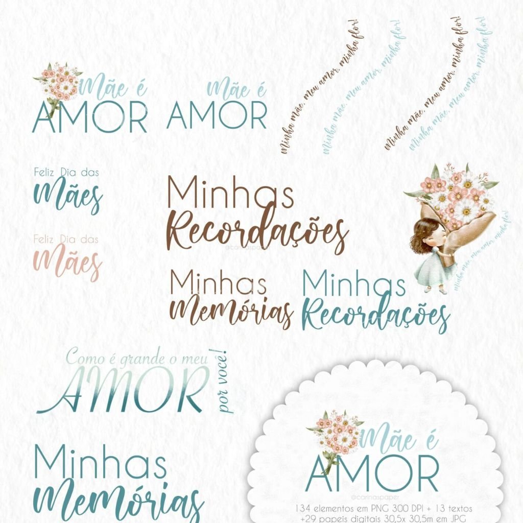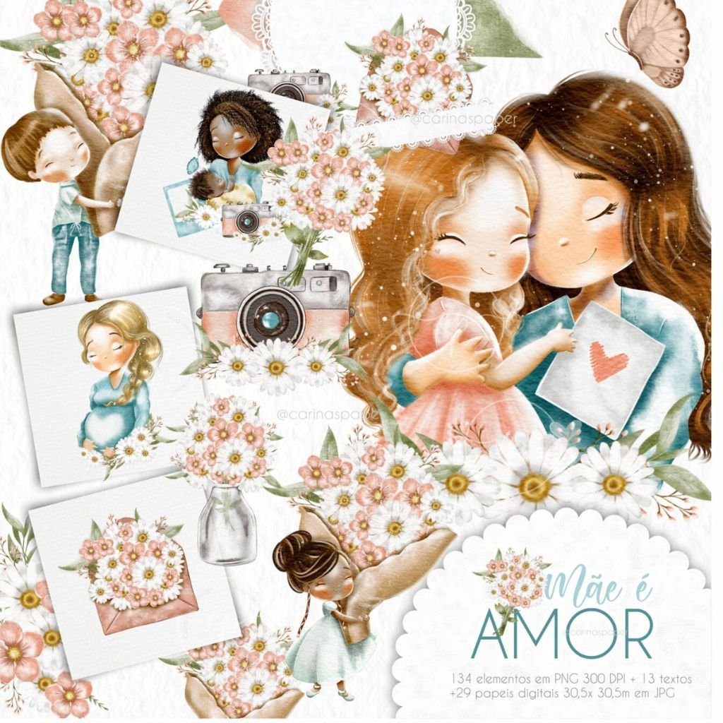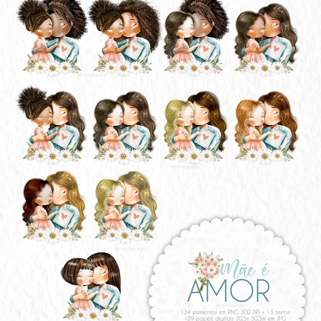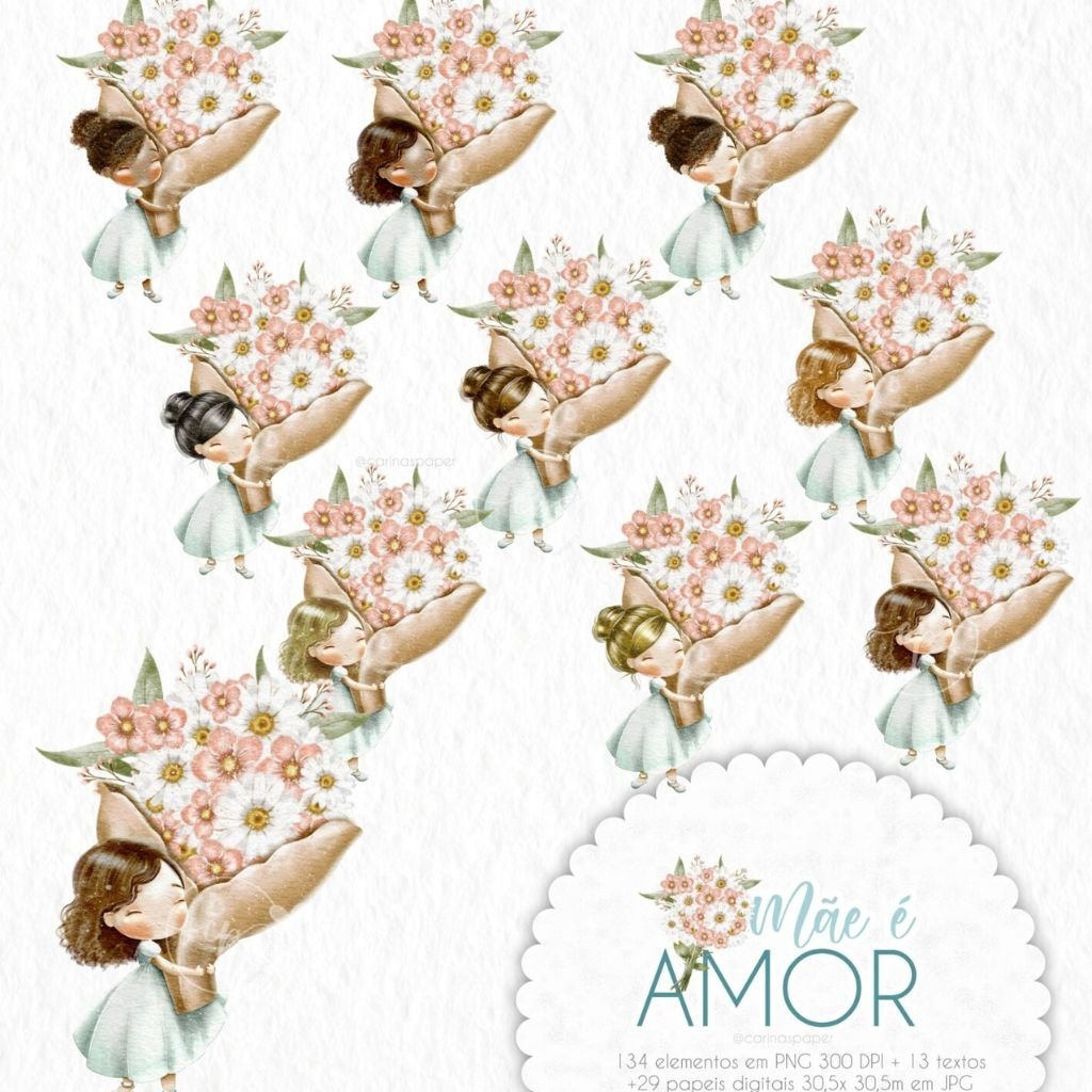 Um kit com ilustrações delicadíssimas para você compor produtos que enchem os olhos como: Cadernos, cartões, papel de carta, marcadores de página, capas de caderno e agenda, sacolinhas, buttons, postit, canecas, scrapbook e embalagens lindas para presentear as mamães nesse dia especial e além.