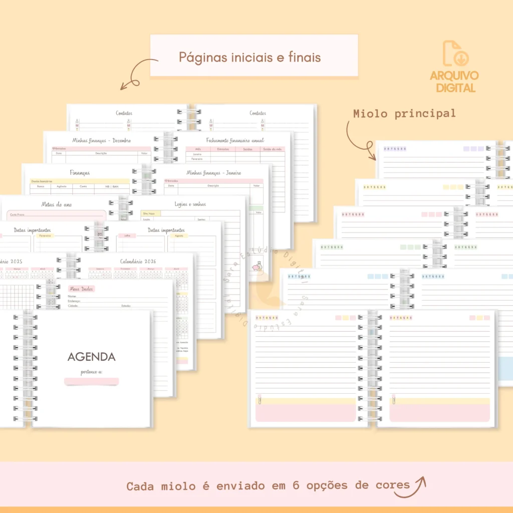 Conteúdo: dados pessoais, calendário, datas importantes, metas, logins e senhas, minhas finanças (Janeiro a Dezembro), fechamento financeiro anual.