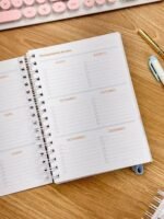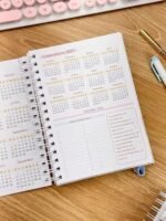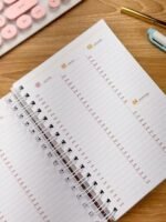 Pág. de dados, calendário 26-27, lista telefônica, logins e senhas, controle de saúde, planejamento anual, metas do ano e planejamento mensal e semanal com marcação do dia da semana e controle financeiro DE JANEIRO A DEZEMBRO.