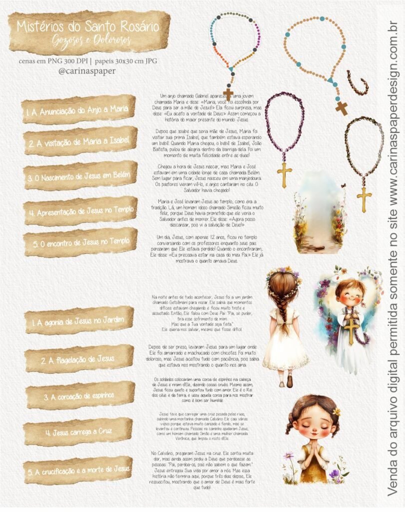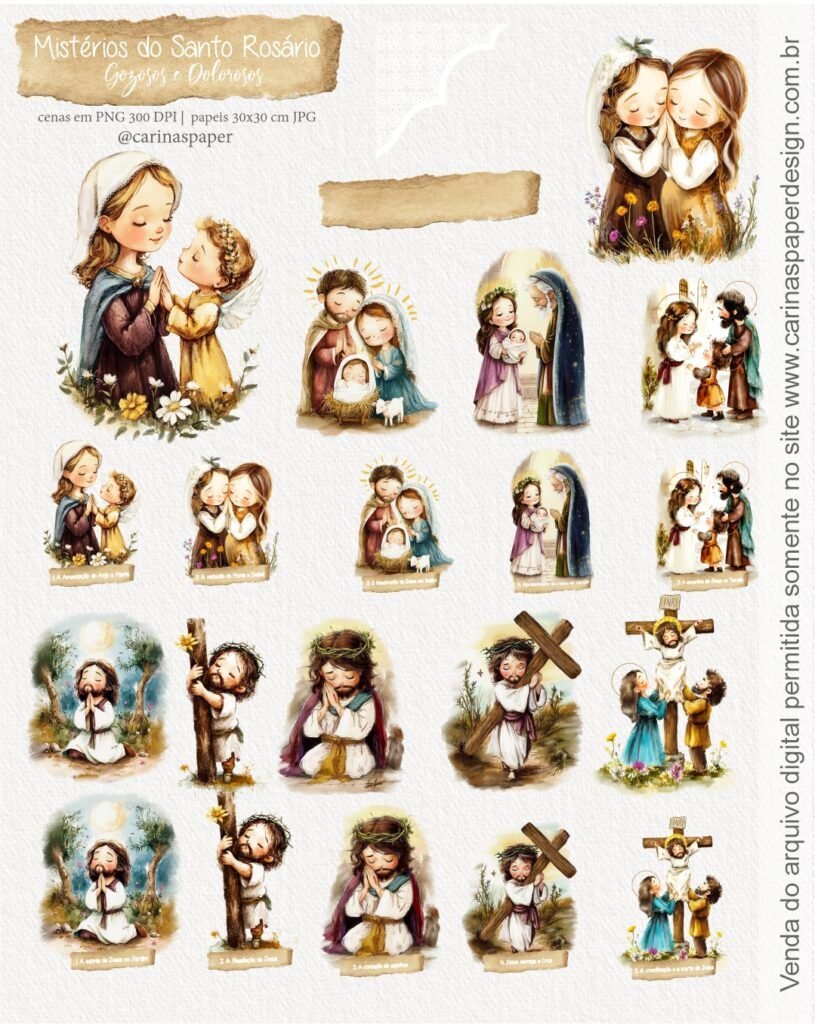 nConteúdo do arquivo: mais de 61 imagens que representam cenas das Contemplações dos Mistérios em PNG fundo transparente entre imagens e textos + 12 papeis 30,5x 30,5 cm em JPG (Ver imagem da loja)