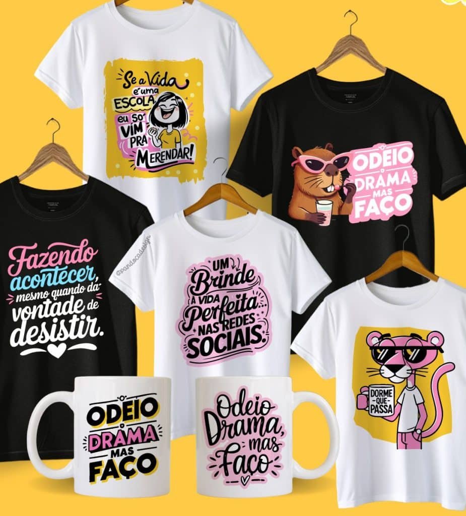 Transforme seus produtos personalizáveis com este pack incrível! São ao todo mais de 100 artes com frases ilustradas em PNG, perfeitas para estampar camisetas, canecas, e muito mais. Além disso, o pack inclui 23 artes exclusivas para canecas, prontas para impressão! ☕