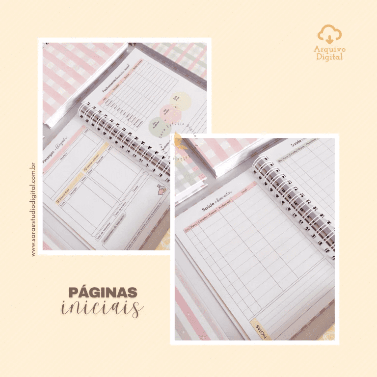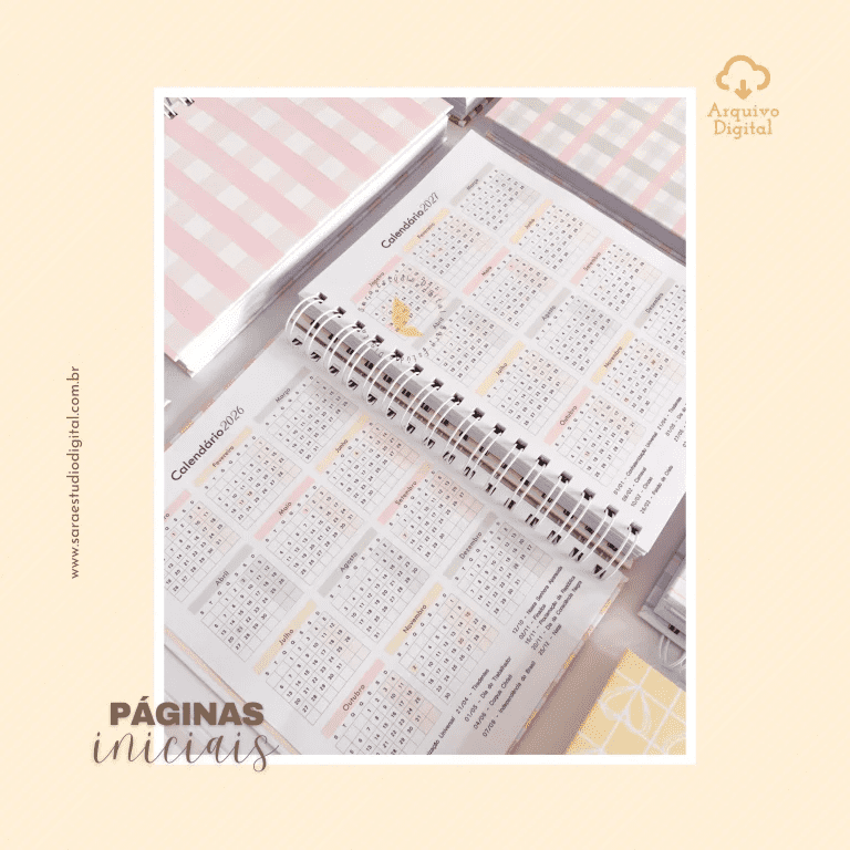 Conteúdo: dados pessoais, calendário 2026 e 2027, datas importantes, metas,  logins e senhas, minhas finanças (Janeiro a Dezembro), fechamento financeiro anual, Saúde e bem-estar (consultas).