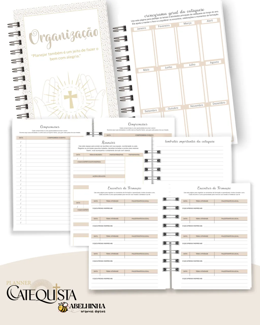 O Planner do Catequista 2026 da Abelhinha foi desenvolvido especialmente para catequistas que desejam organizar seus encontros, planejamentos e registros com espiritualidade, beleza e funcionalidade. Com um design delicado e inspirado na fé católica, ele une planejamento pastoral e vivência cristã ao longo de todo o ano.