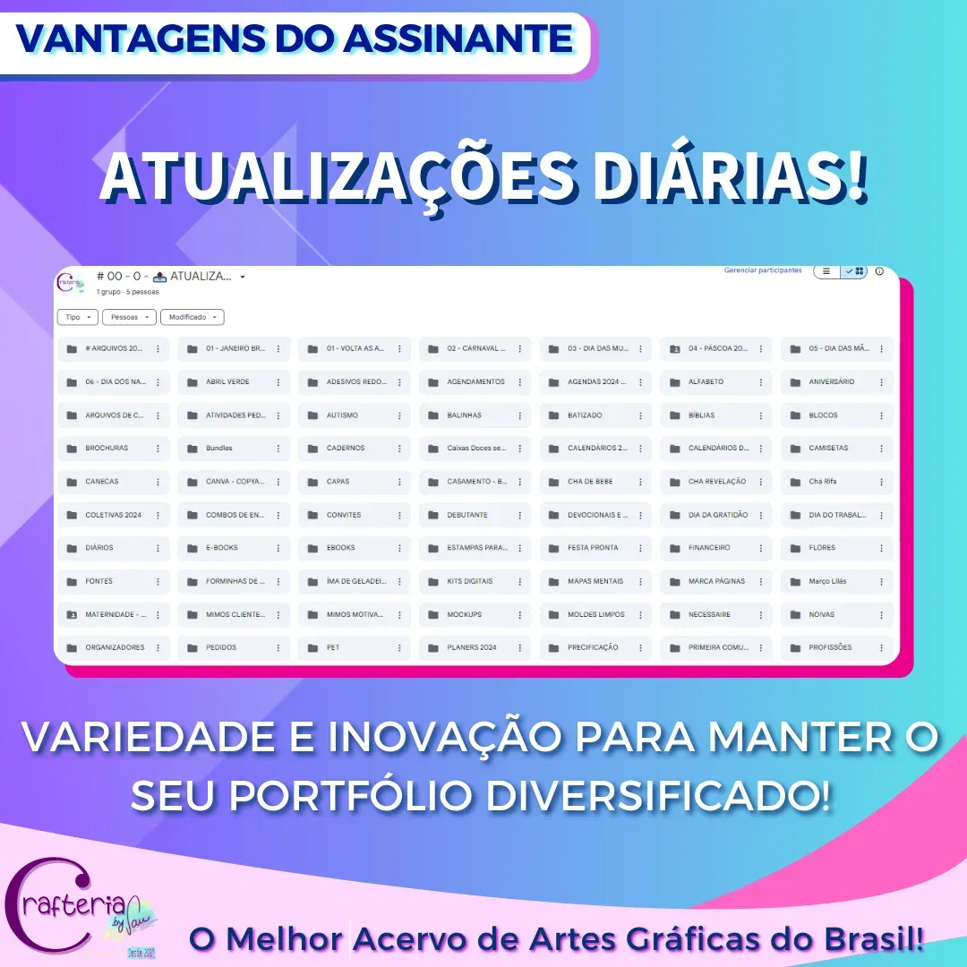 - Acervo completo no Google Drive: milhares de arquivos prontos para usar, organizados e sempre disponíveis.