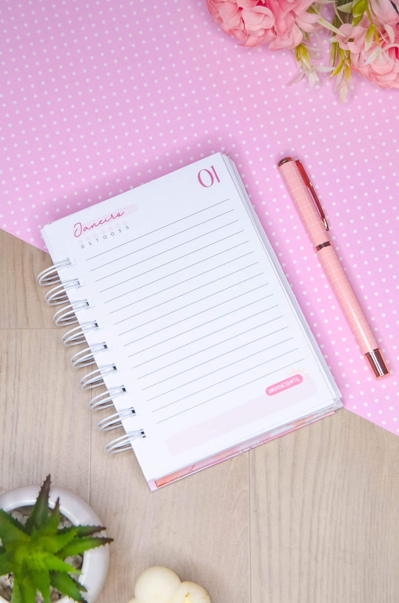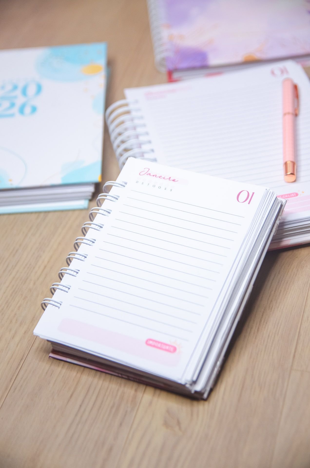 Páginas iniciais – 7 cores – 24 páginas (Dados pessoais, Calendários 2025 e 2026, Contatos, Logins e senhas, Pix importantes, Datas importantes, Controle Financeiro mensal e anual).