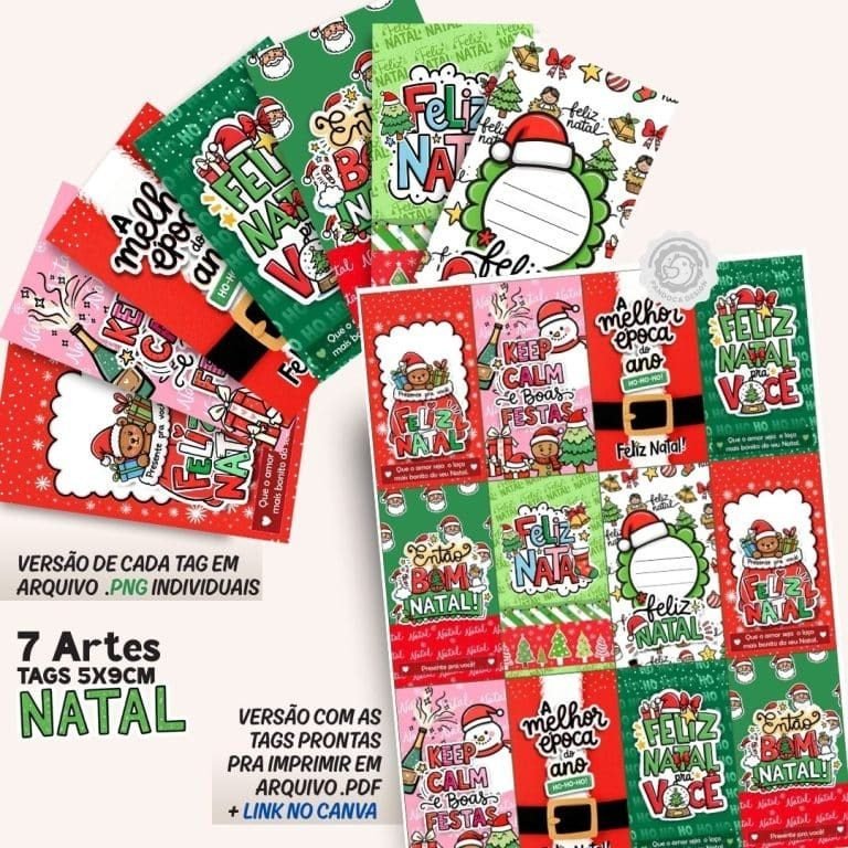Você recebe as artes em PNG individuais e também arquivo PDF pronto para impressão + link no Canva para editar se desejar. Ideal para empreendedores, papelarias criativas e quem ama caprichar nos detalhes de Natal!