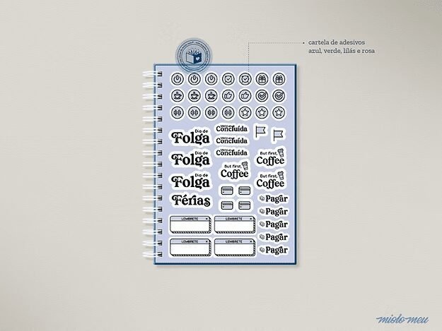 - Cartela de adesivos em PNG + DXG/SVG nas cores: azul, verde, lilás, rosa e bege;
