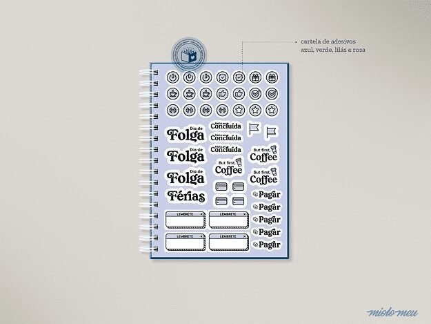 - Cartela de adesivos em PNG + DXG/SVG nas cores: azul, verde, lilás, rosa e bege;