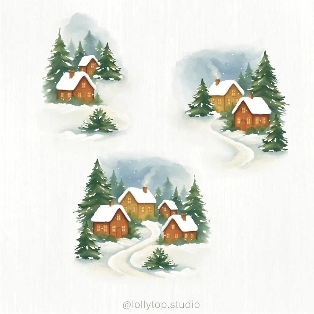 A Coleção Vila de Natal – ilustrações e papeis digitais em aquarela no estilo vintage infantil, perfeitas para projetos de Natal cheios de magia e aconchego.