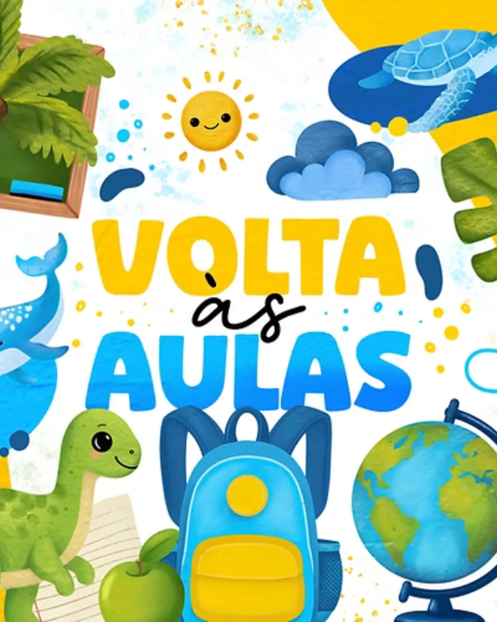 - Elementos ilustrativos como lápis, mochilas, cadernos e ícones escolares.
